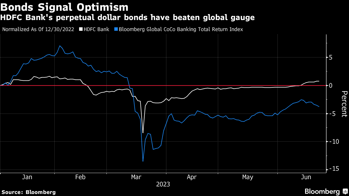 HDFC Bank, which counts JPMorgan among its largest investors, is enjoying high levels of investor confidence. Its contingent convertible bonds — the riskiest type of debt that can convert to equity if a lender runs into trouble — has outperformed its global peers. The perpetual dollar notes of HDFC Bank handed investors a return of 3.1% so far this year, even as Bloomberg's index of global banks' coco bonds lost 3.5%.