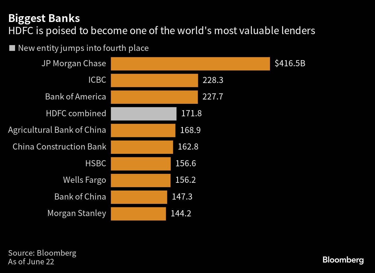 The tieup of HDFC Bank Ltd. and Housing Development Finance Corp. creates a lender that ranks fourth in equity market capitalization, behind JPMorgan Chase & Co., Industrial and Commercial Bank of China Ltd. and Bank of America Corp., according to data compiled by Bloomberg. It's valued at about $172 billion.