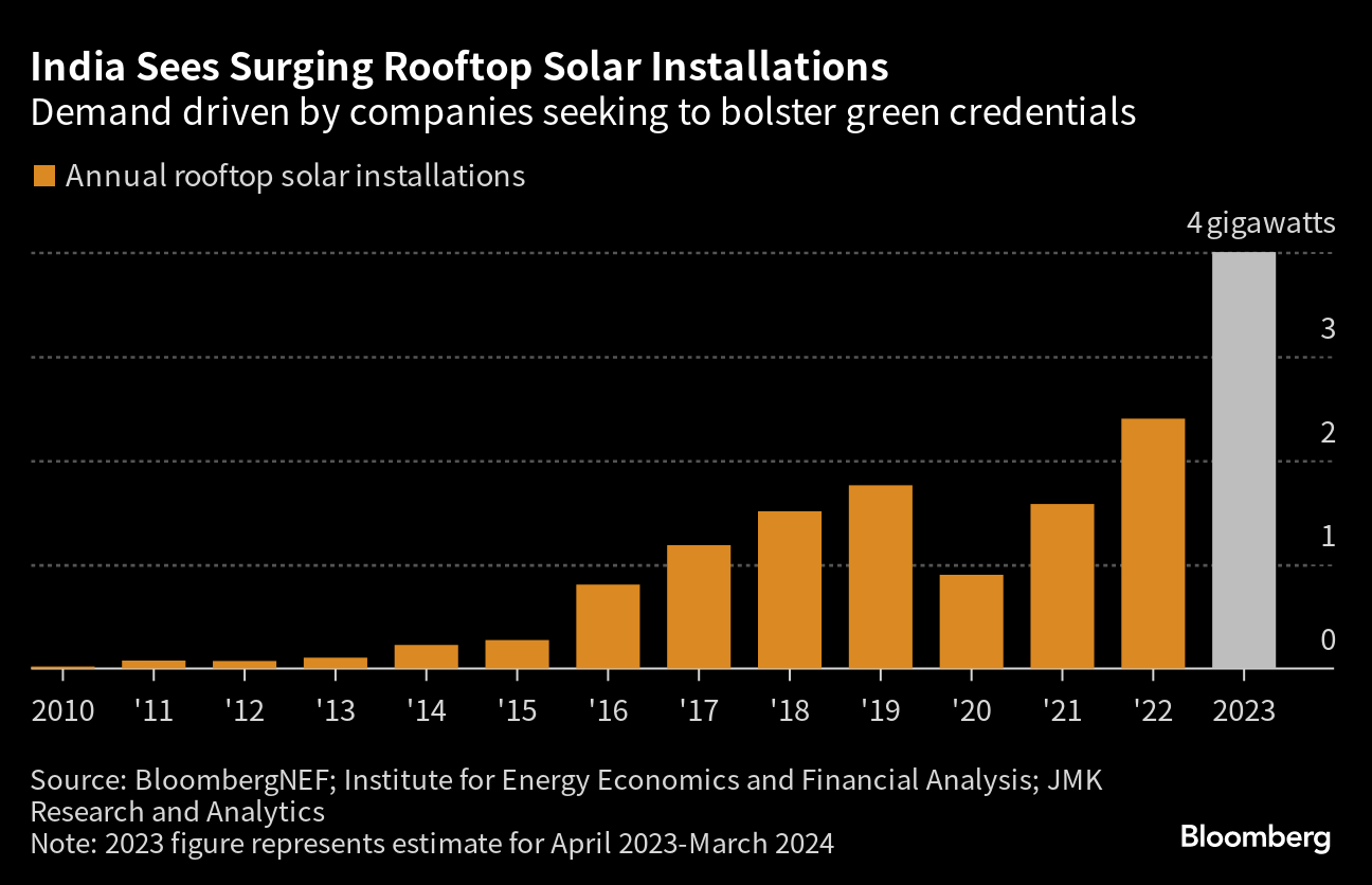 (Bloomberg) -- India is seeing record demand for rooftop solar as companies seek to add clean energy to meet climate goals amid falling panel prices.