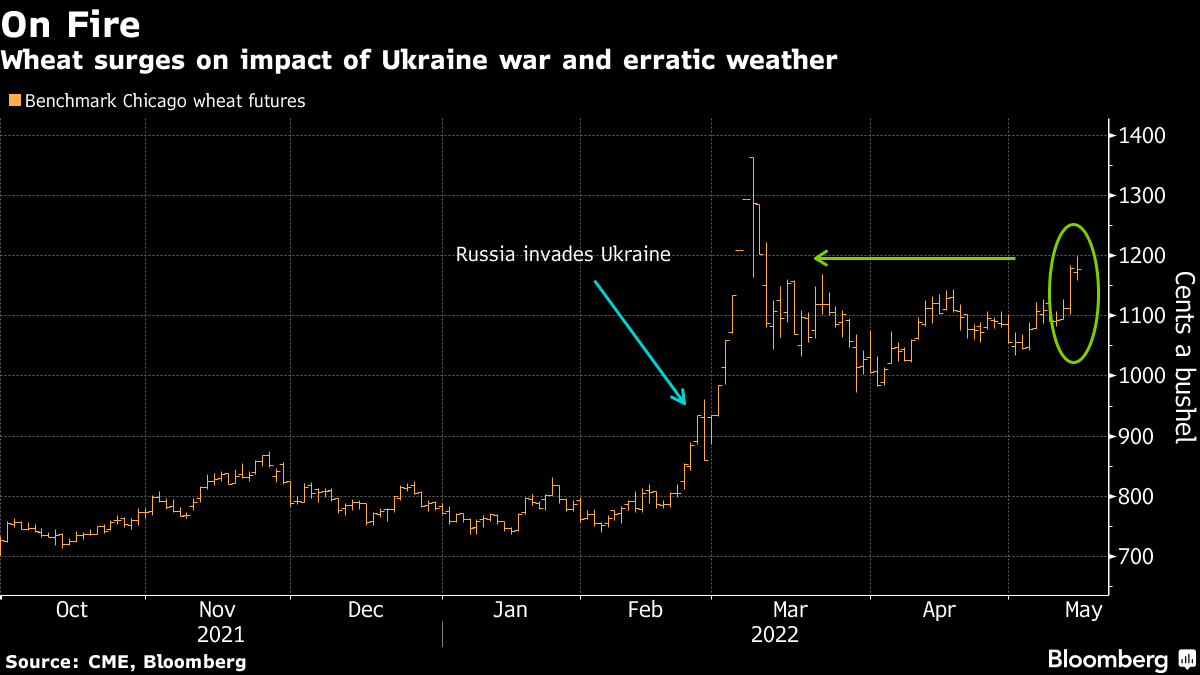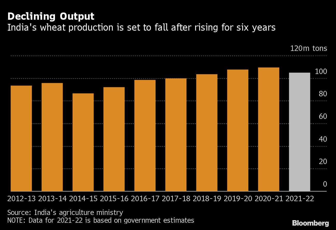 Bloomberg News reported earlier this month that a record-shattering heat wave has damaged wheat yields across the South Asian nation, prompting the government to consider export restrictions. The food ministry had said it didn't see a need to control exports, even as the government cut estimates for India's wheat production.