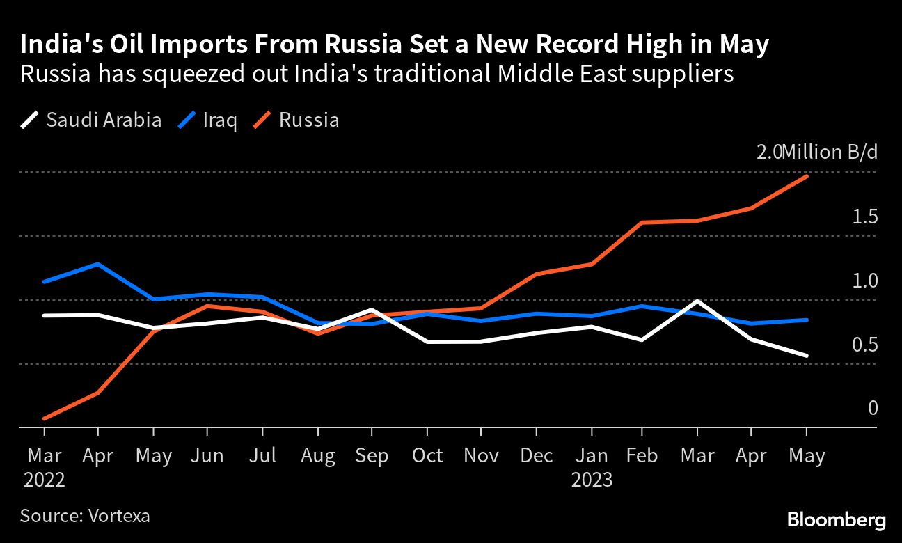 The South Asian nation took 1.96 million barrels a day from Russia last month, 15% more than the previous high in April, according to data from Vortexa Ltd. Shipments from Saudi Arabia slipped to the lowest level since February 2021, figures from the shipping analytics company show.