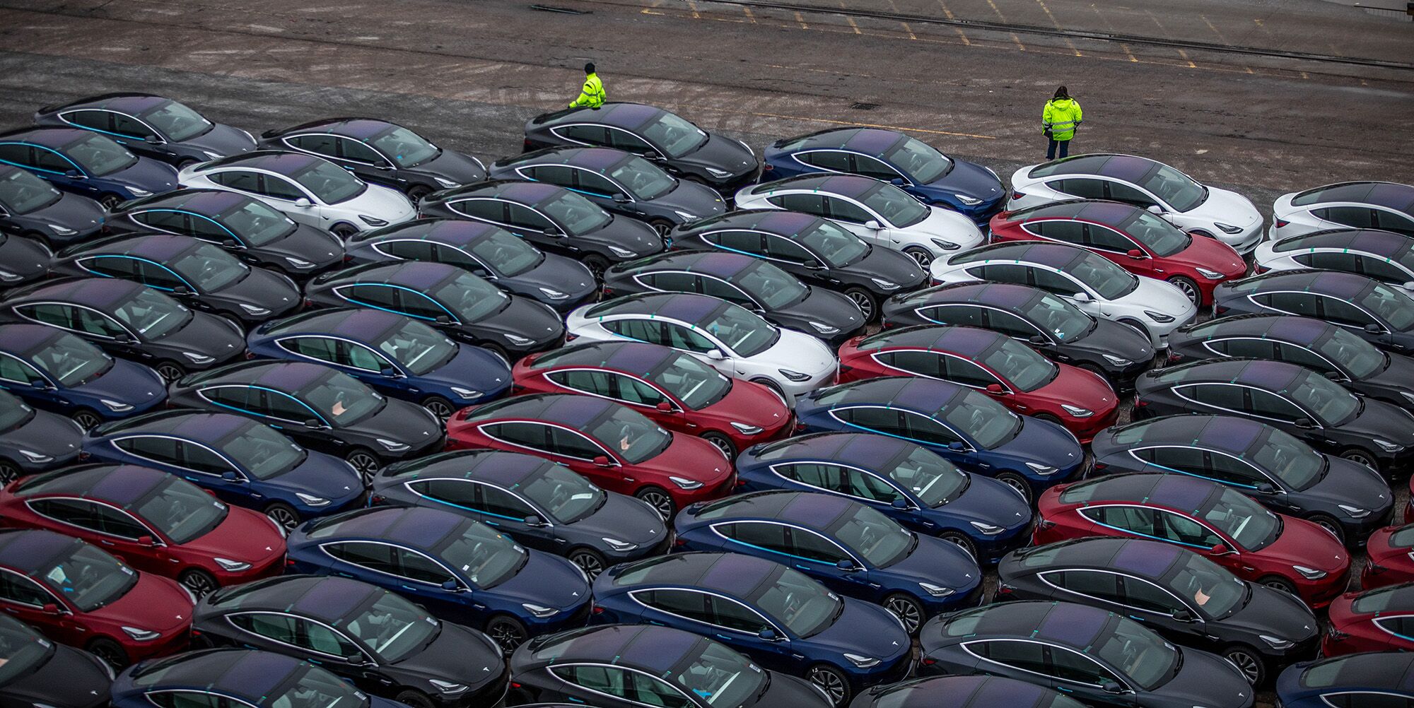 Automobiles produced by Tesla Inc. sit dockside after arriving on the Glovis Courage vehicles carrier vessel at the Port of Oslo in Oslo, Norway.