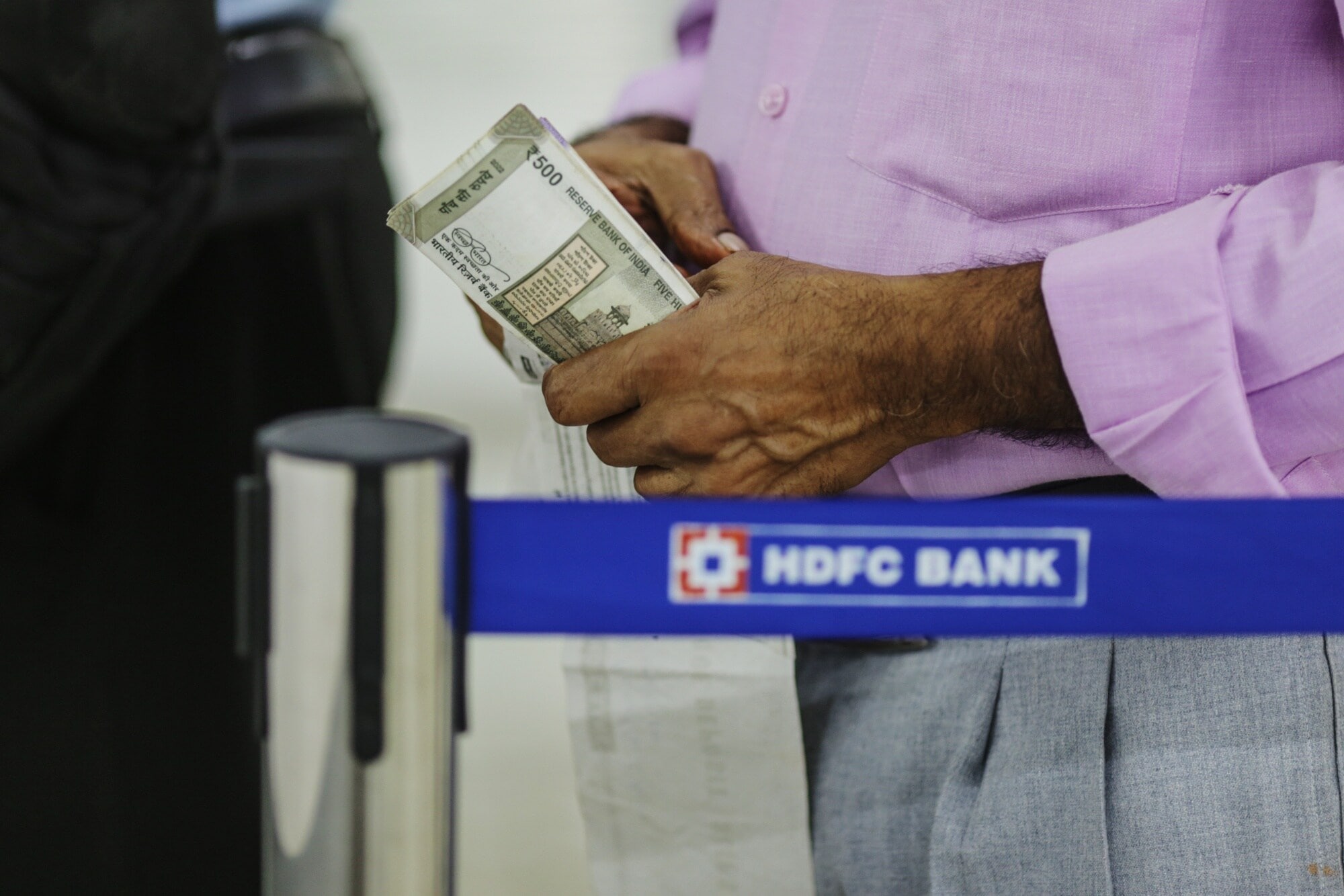 Customers queue to deposit Indian rupee banknotes at a HDFC Bank Ltd. bank branch in Mumbai.