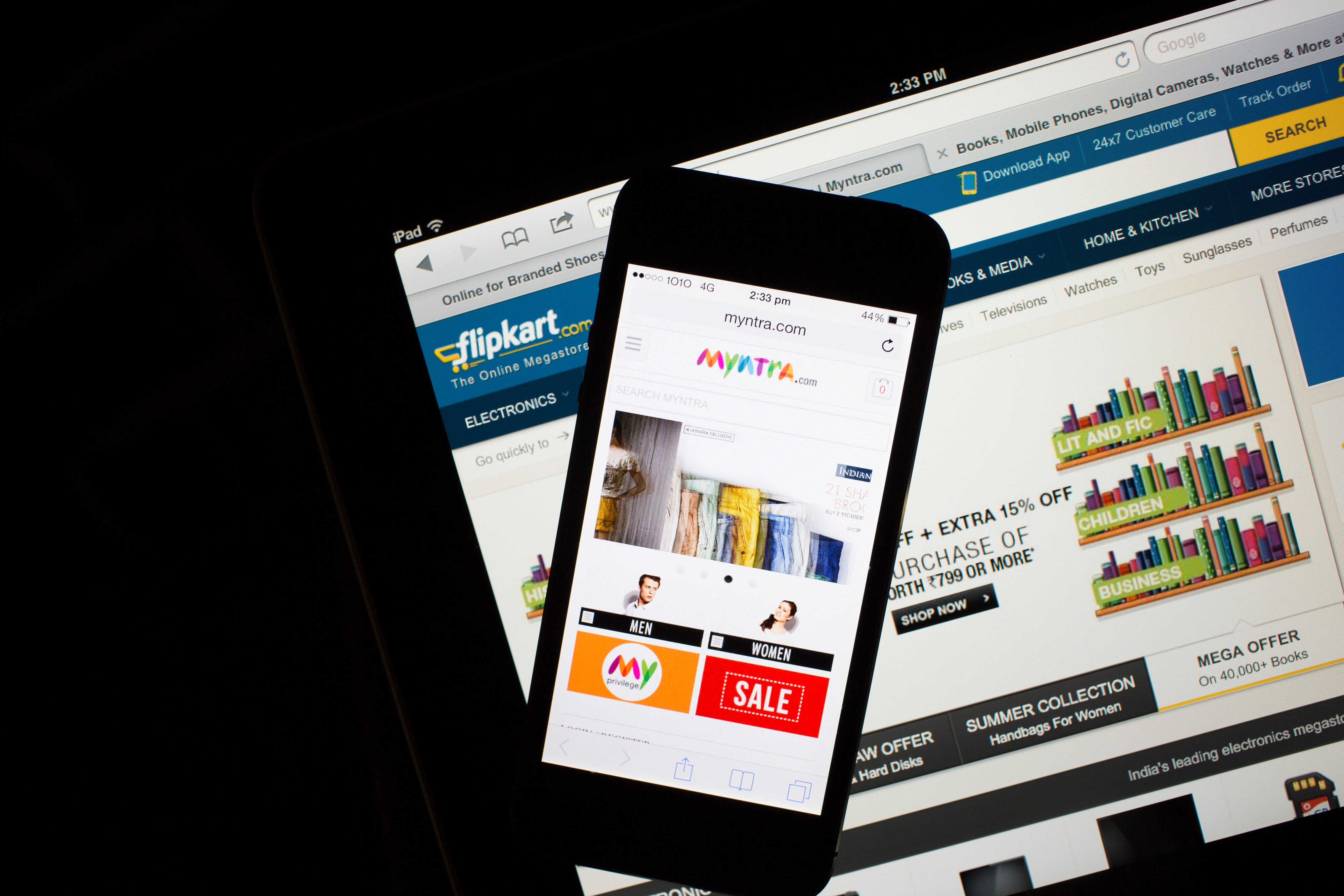 The websites for Flipkart, bottom, and Myntra.com are displayed on an Apple Inc. iPad and iPhone 5c. (Photographer: Brent Lewin/Bloomberg)