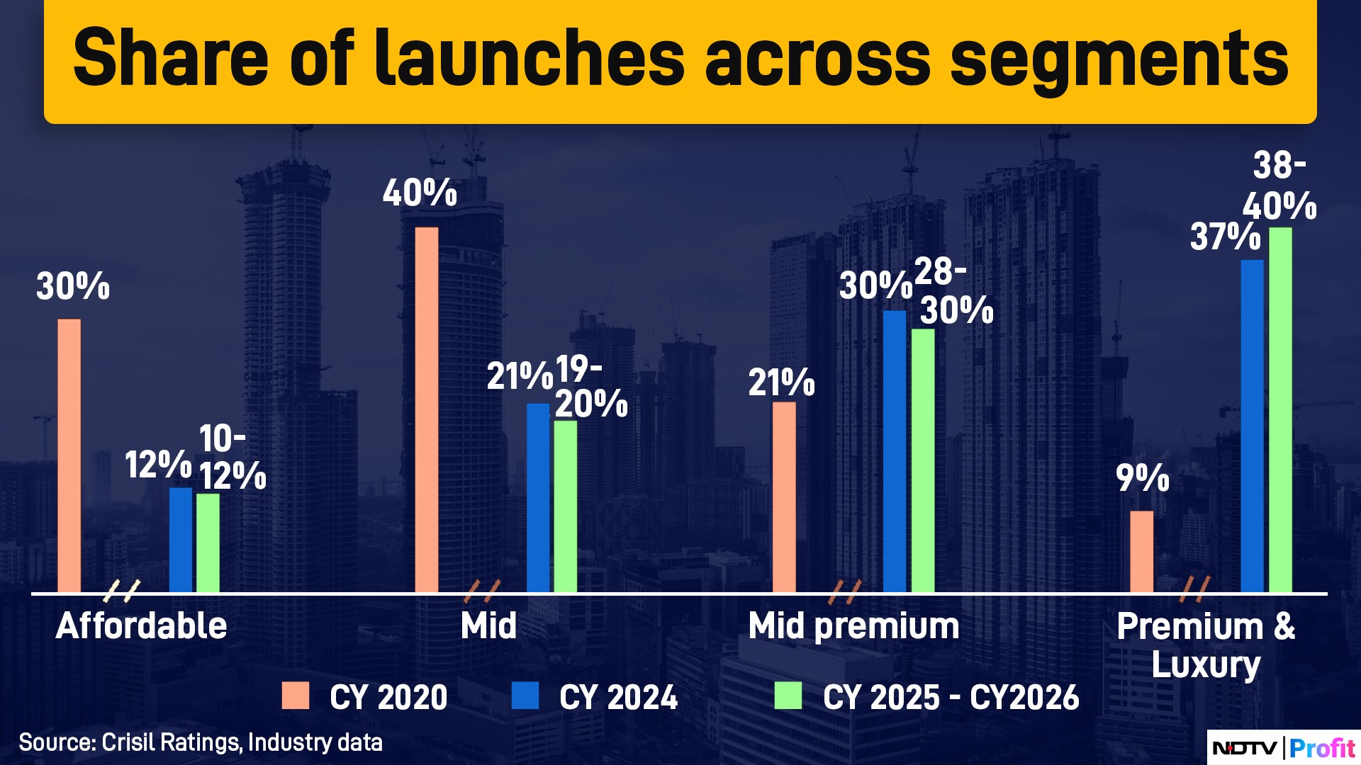 In contrast, the affordable and mid-segments are likely to account for only 10-12% and 19-20%, respectively. This represents a steep decline from 30% and 40%, respectively, in calendar year 2020. Rising land and raw material costs have rendered these segments less viable for developers, leading to a shift in focus towards the more lucrative premium and luxury segment.