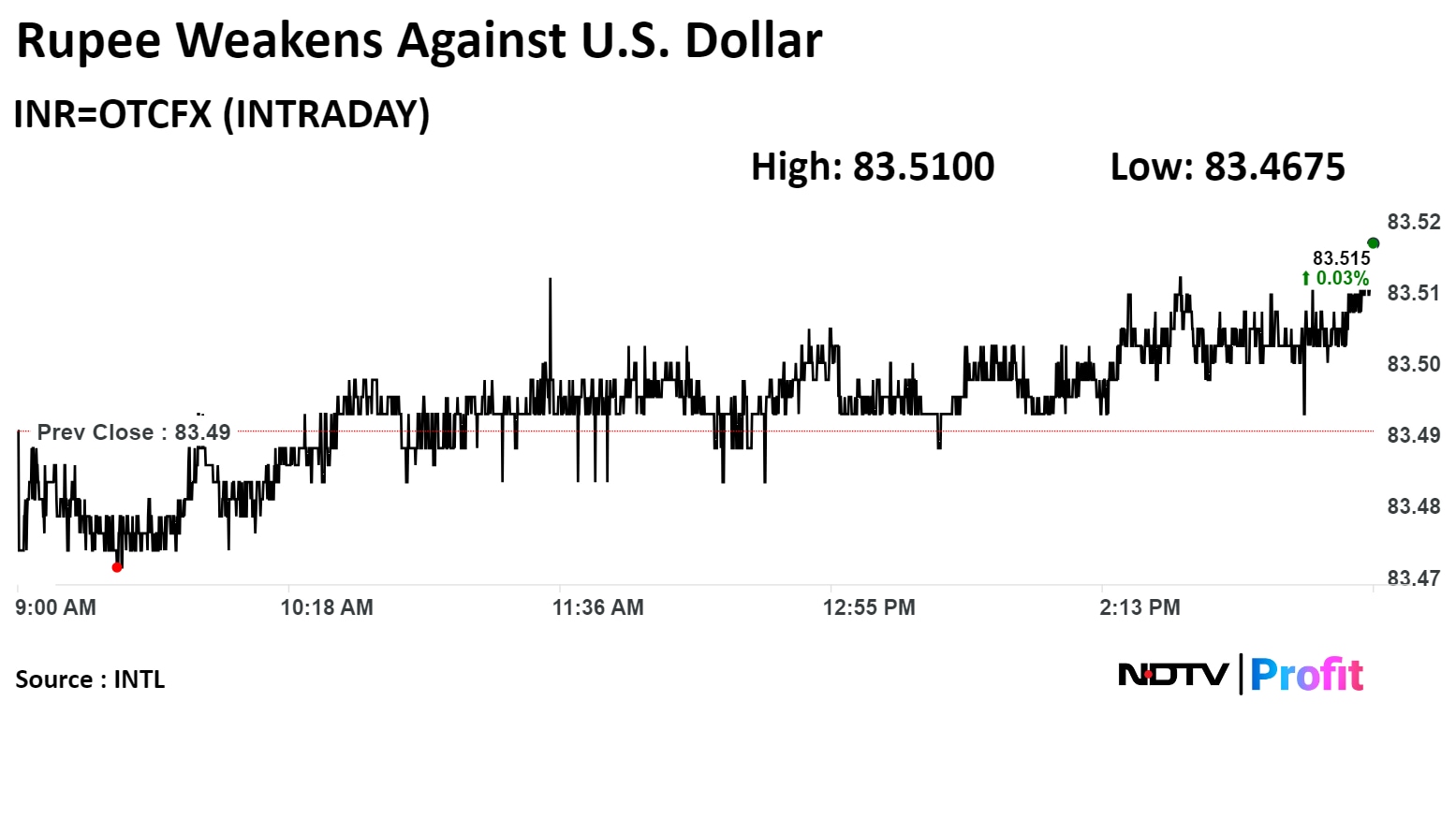 The local currency closed 2 paise weaker against the US dollar at Rs 83.51. It closed at Rs 83.49 on Monday, according to Bloomberg data.