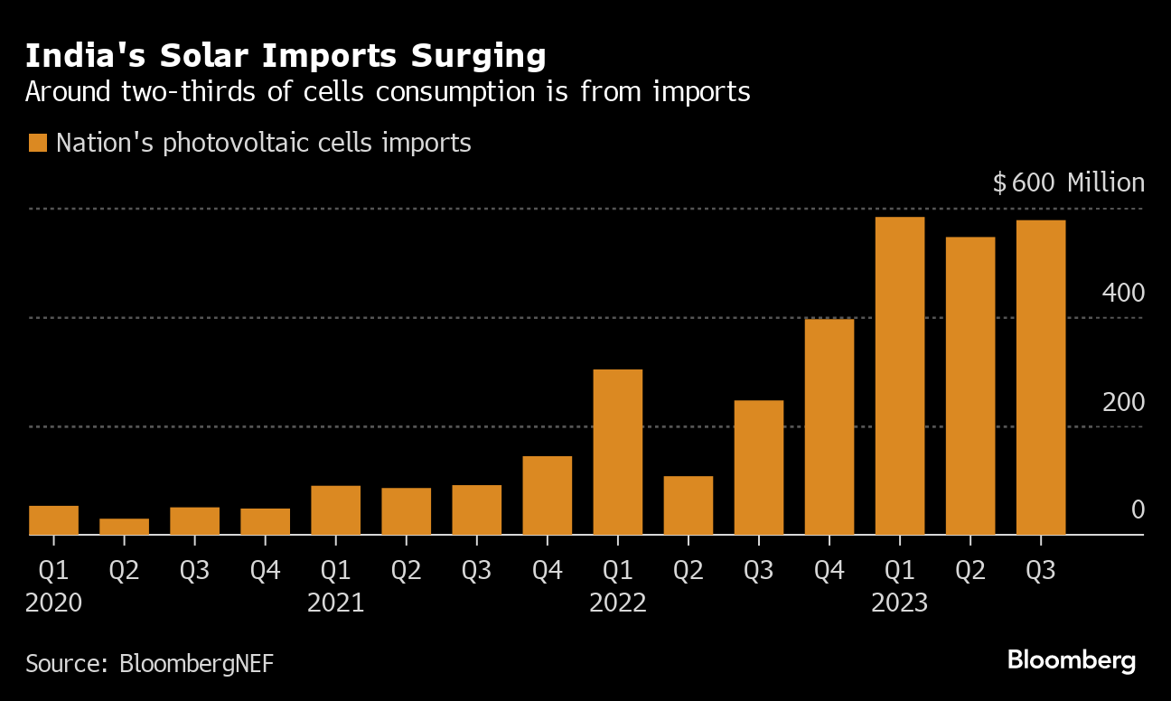Solar panel imports hit an 18-month high in September, while purchases of photovoltaic cells in value terms in the first nine months of this year were higher than for the whole three years through 2022, BNEF said in a report released Friday. The country is particularly dependent on its geopolitical rival China, which has produced 57% to 100% of Indian imports of products including modules, cells, wafers and solar glass since the start of 2021, it said.