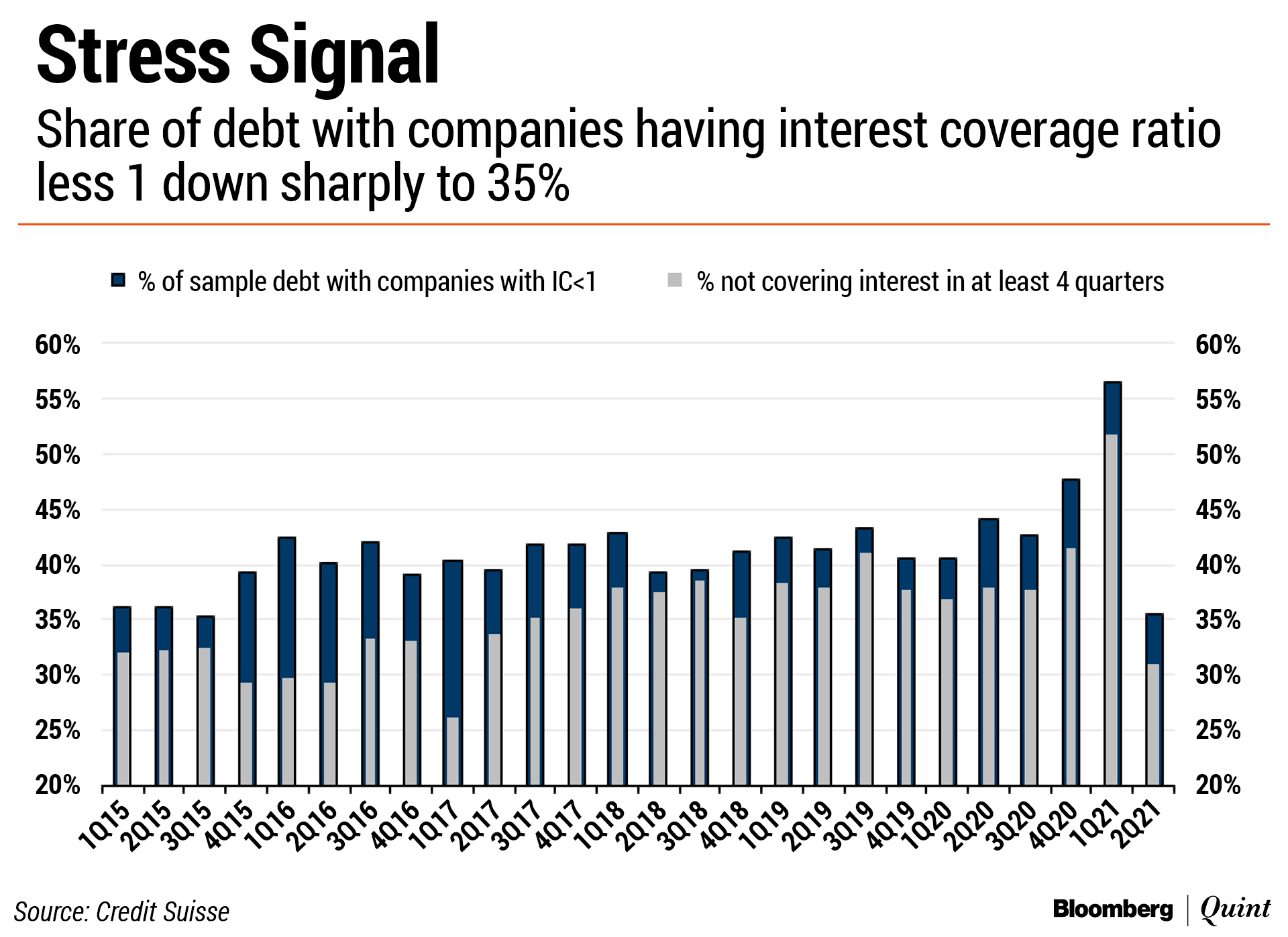 The share of debt among stressed Indian companies across sectors, which have an interest coverage ratio of less than one, has reduced sharply to 35% in the July-September quarter of fiscal ending March 2021, Credit Suisse said in its ‘India Corporate Health Tracker' report published on Nov. 19. Total share of debt with stressed companies across sectors fell to Rs 15 lakh crore in the second quarter from Rs 23.8 lakh crore in the three months ended June, according to the report.