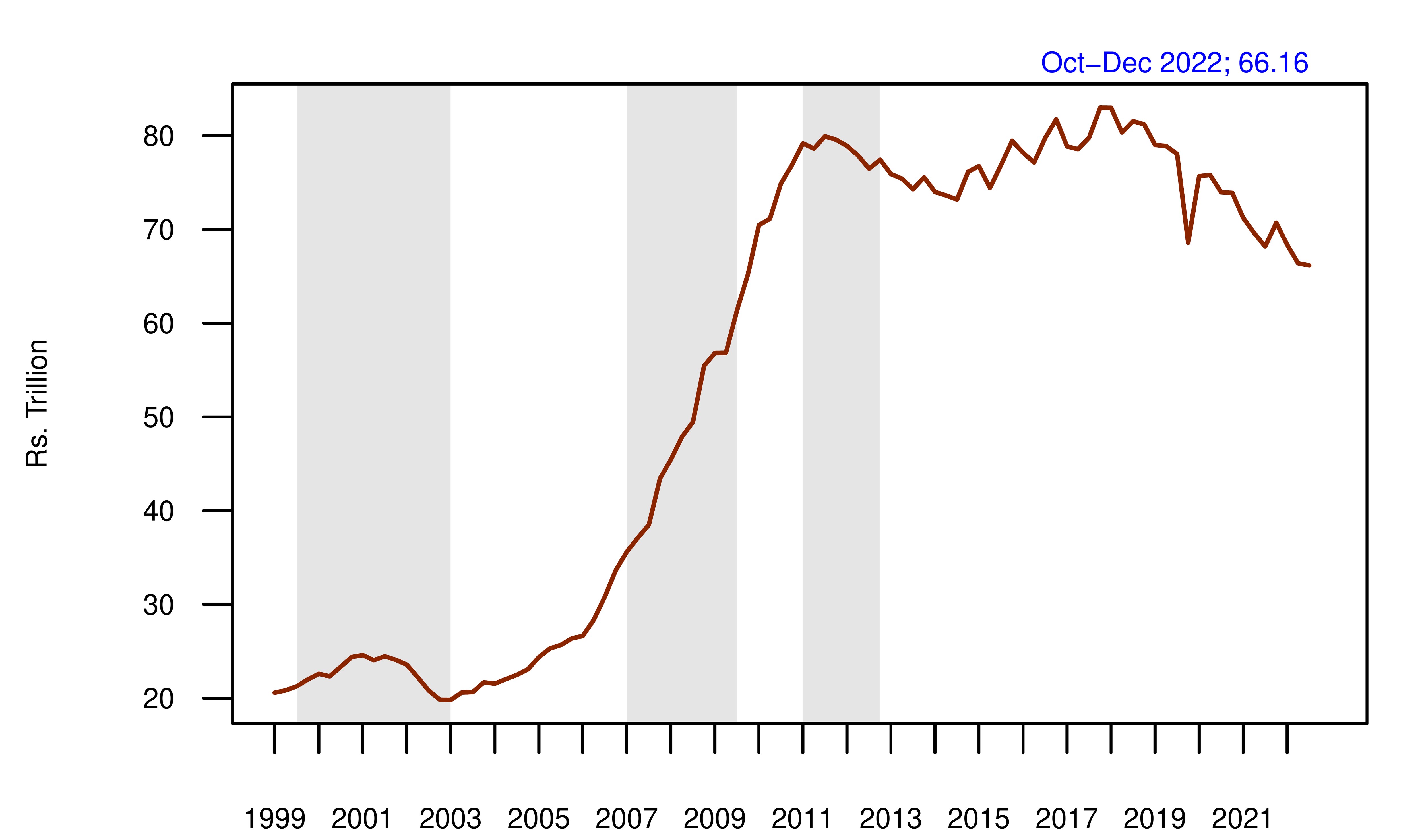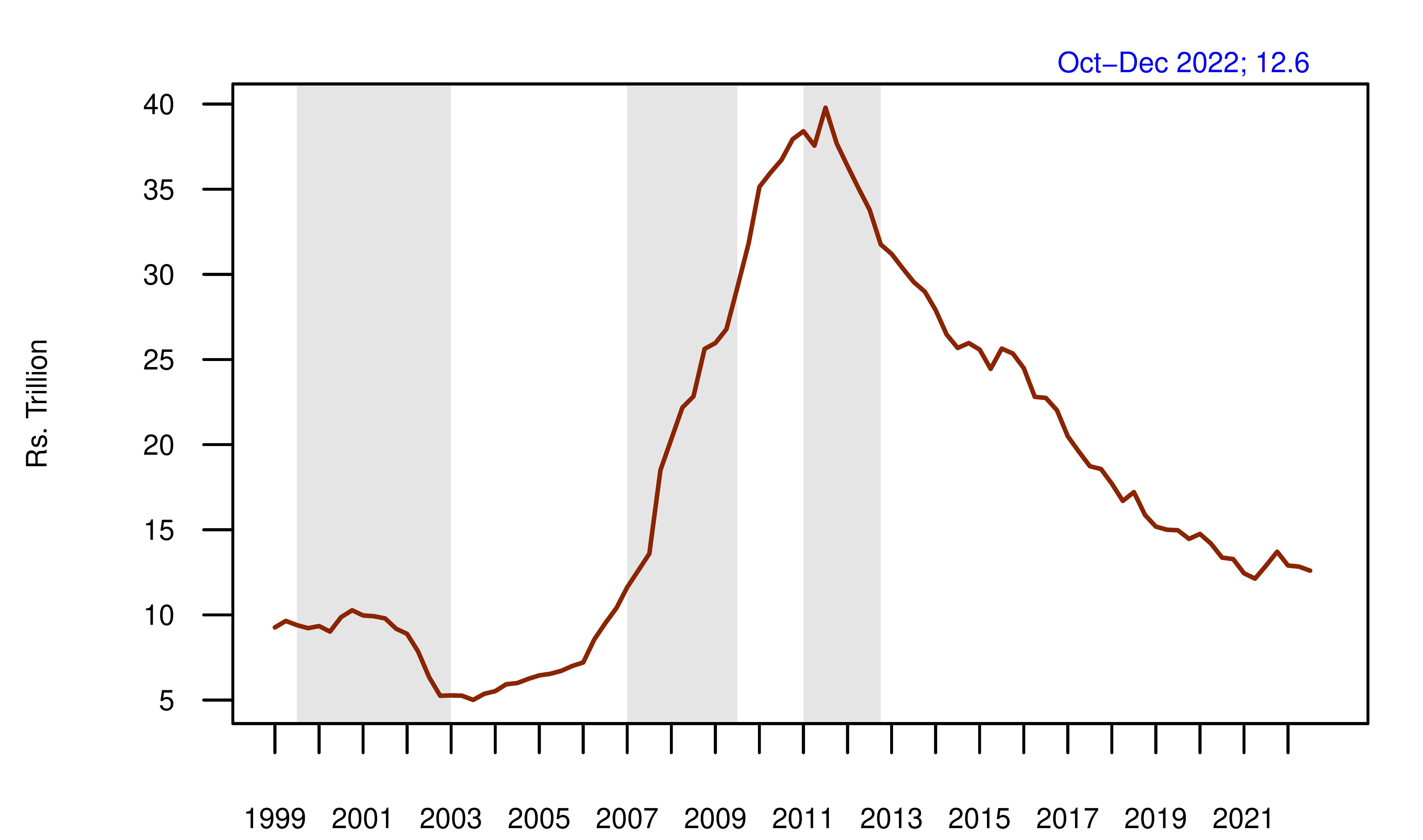 This graph shows a great surge in the period from 2003 to 2011 and a reduction of about Rs 14 lakh crore thereafter.