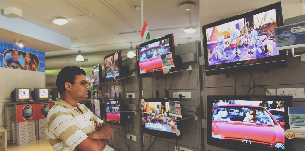 A man LCD televisions at a retail showroom in Bangalore, India (Photographer: Namas Bhojani/Bloomberg)