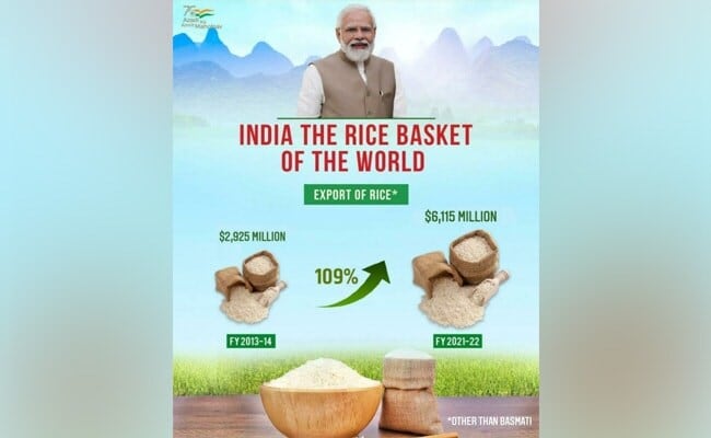 India's rice exports have grown 109 per cent between 2013-14 and 2021-22, tweeted Piyush Goyal, commerce and industry minister, on Sunday.