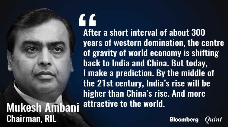 India has the potential to triple its gross domestic product to $7 trillion from $2.5 trillion currently in the next ten years, Ambani said. He expects India to hit the $10 trillion mark by 2030, closing the gap between established economies like the U.S. and China.