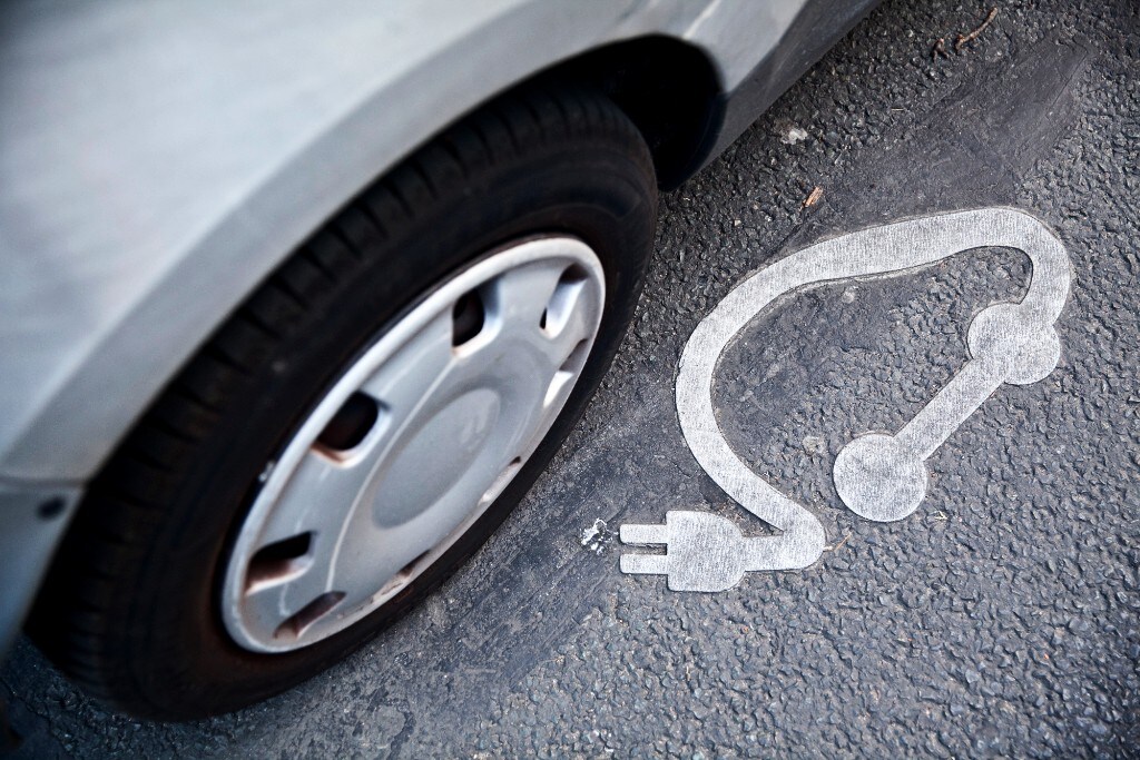 An electrical plug symbol sits on a road surface beside a Autolib’ electric automobile in Paris, France (Photographer: Balint Porneczi/Bloomberg)