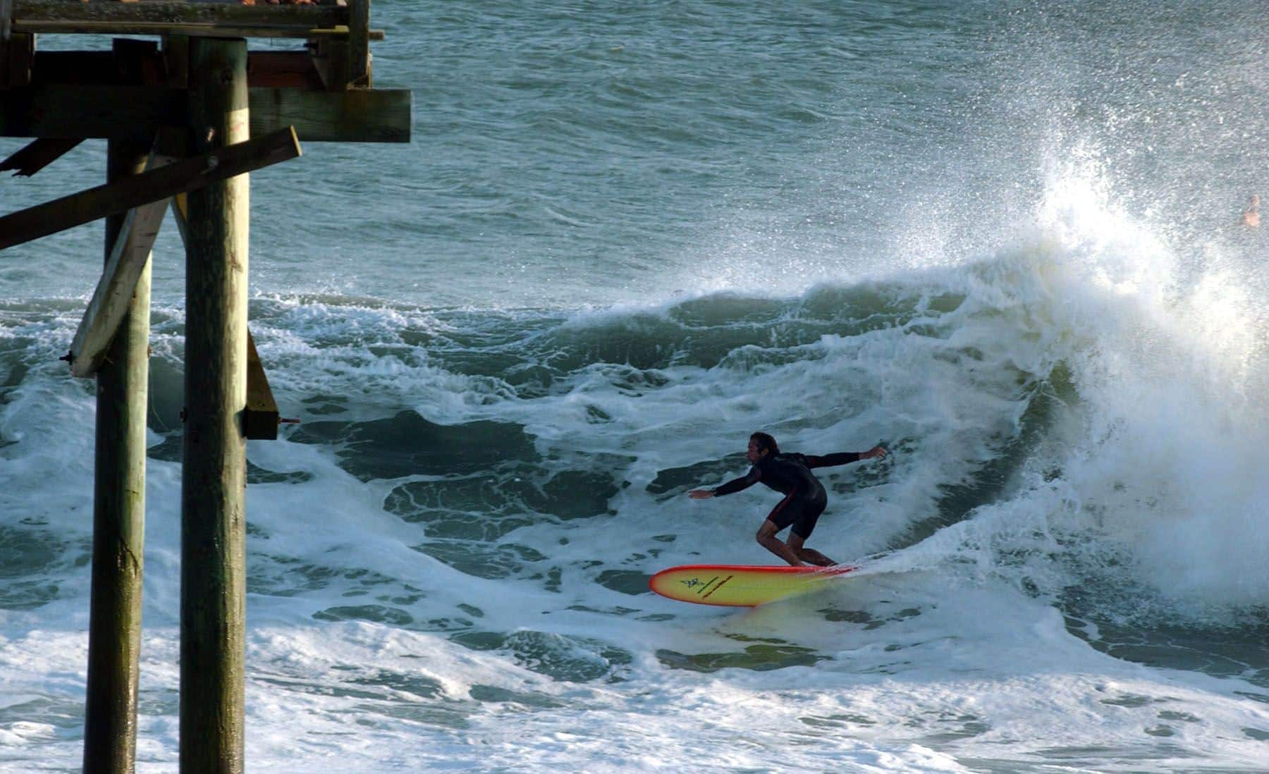 A surfer takes advantage of the heavy swells caused by Hurricane Isabel off Atlantic Beach, North Carolina. (Photographer: Scott Taylor/Bloomberg News)