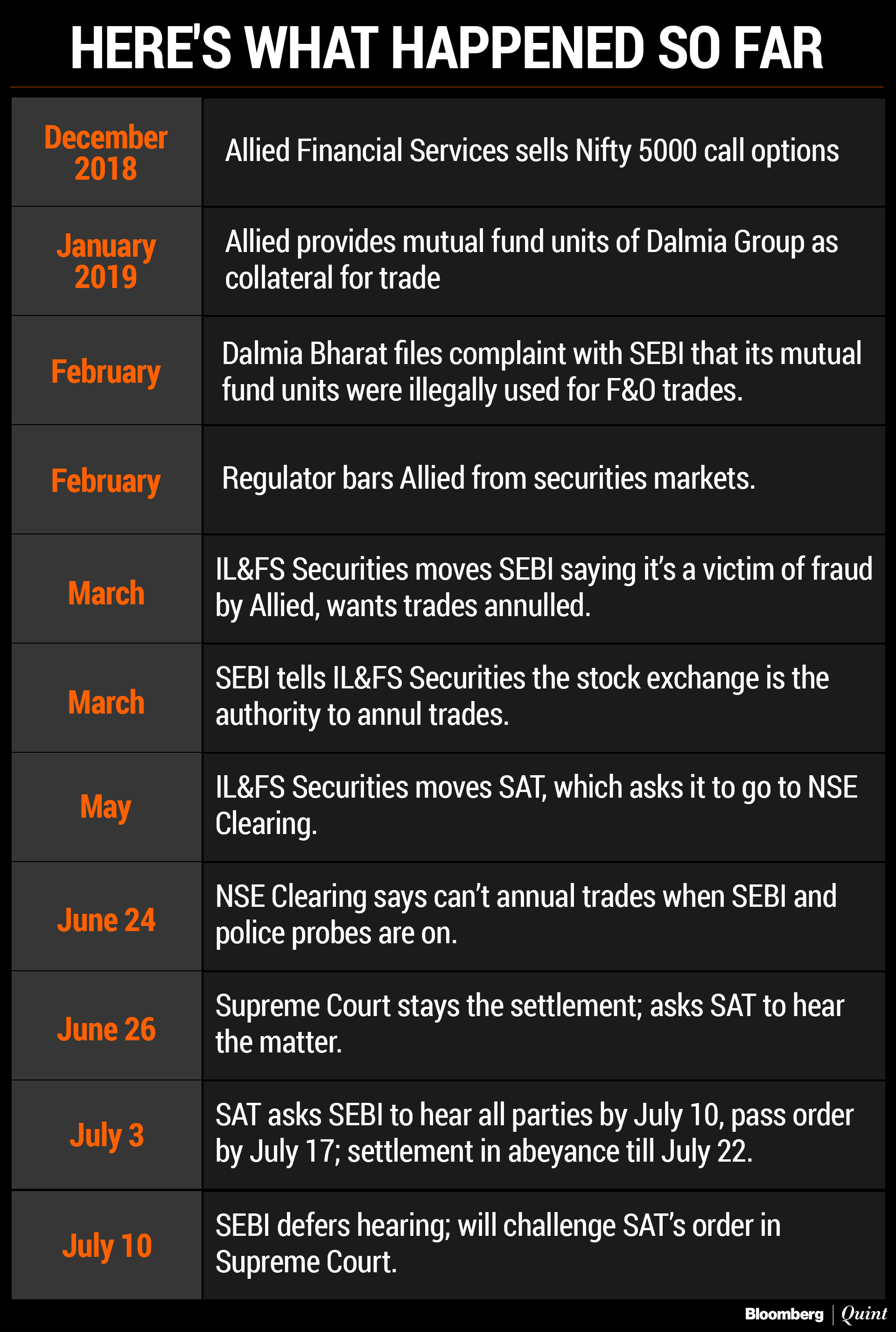 Allied Financial Services, through its clearing member IL&FS Securities Services Ltd., sold Nifty 5000 call options in December expiring in June. As a collateral, it offered mutual fund units and received a premium of Rs 380 crore. But Dalmia Bharat group alleged that the units of its companies were fraudulently transferred to be used as a security, and filed complaints with the police and SEBI, according to exchange filings. The regulator froze the mutual fund units, forcing IL&FS Securities to replace mutual fund units with cash since, being the counterparty, it was required to maintain the margin.