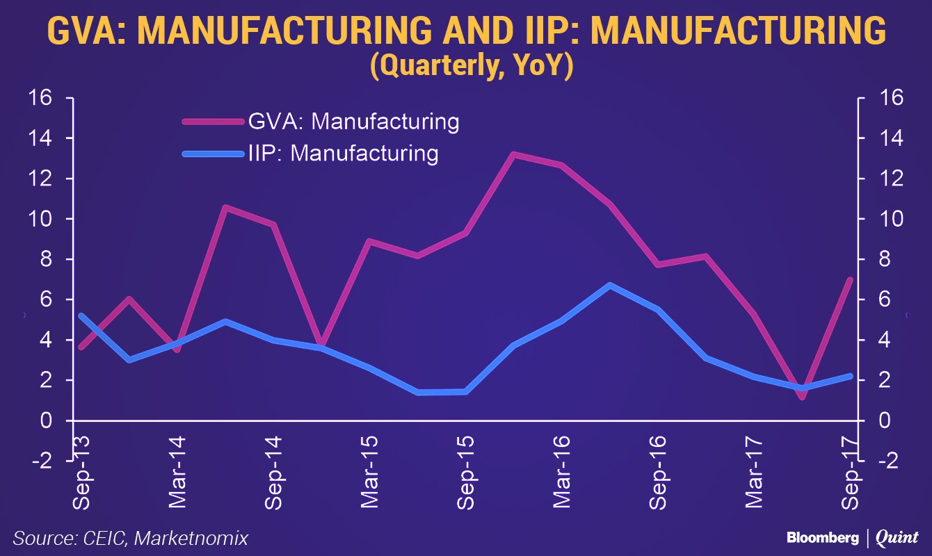 What is worrying about the Q2FY18 GDP number is that a large part of the uptick is attributed to the 7 percent growth in GVA: Manufacturing, while IIP: Manufacturing has grown by a mere 2.2 percent in the same period. While the IIP number reflects production numbers, the GVA number is calculated using financial accounts of firms on a quarterly basis.