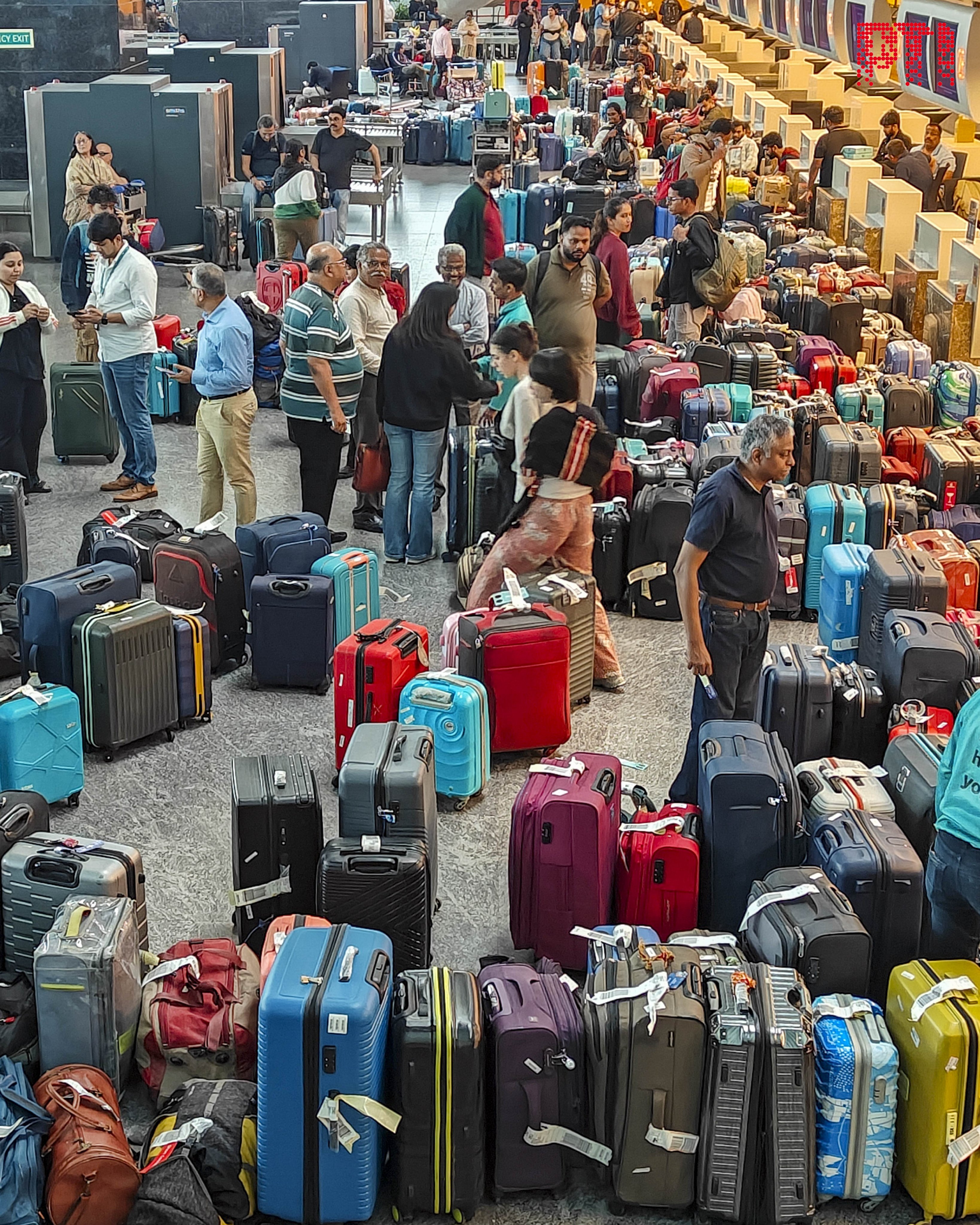 Stranded passengers search for their luggage near a counter at the Kempegowda International Airport in Bengaluru after IndiGo cancelled more than 400 flights at various airports on Friday.