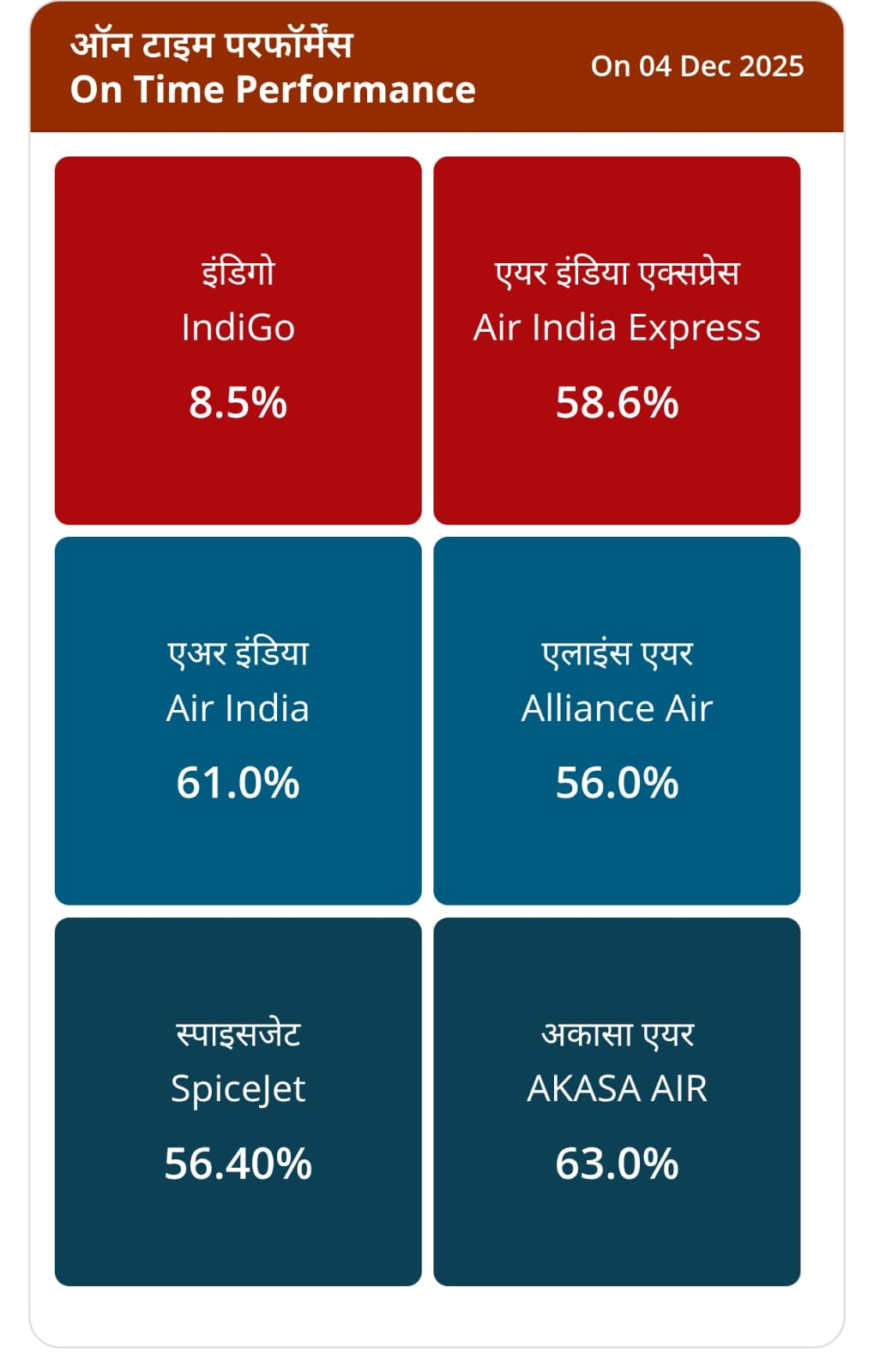 IndiGo's OTP on Dec. 04 slipped below 10%, to stand at 8.5%.
