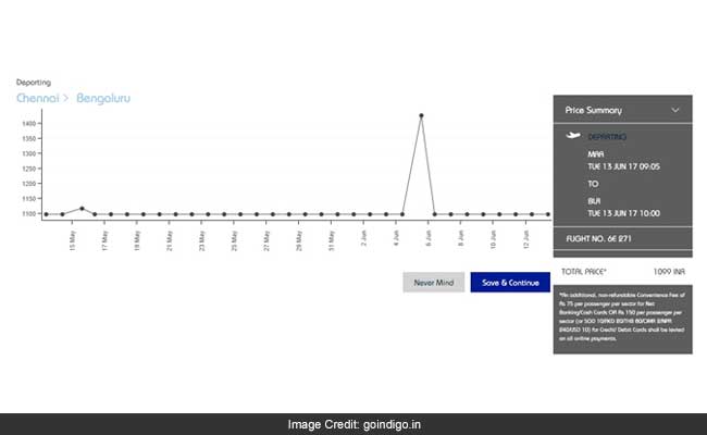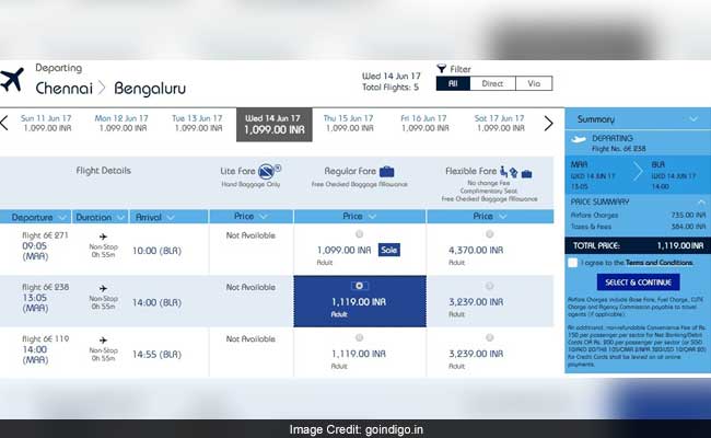 A search on the IndiGo portal on Monday showed a flight from Chennai to Bengaluru on June 14, 2017 was available at a total price of Rs 1,119 (including airfare charges, tax and fees).
