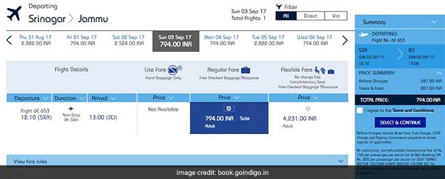 A search on the IndiGo bookings portal showed tickets for flights from Srinagar to Jammu in July were being offered at Rs 794.Other fares under the discounted fares scheme included Rs 999 for flights from Jammu to Srinagar; Rs 1,089 for Delhi-Jaipur; Rs 1,104 for Visakhapatnam-Hyderabad, Rs 1,165 for Agartala-Guwahati, Rs 1,179 for Madurai-Chennai, the IndiGo website noted.