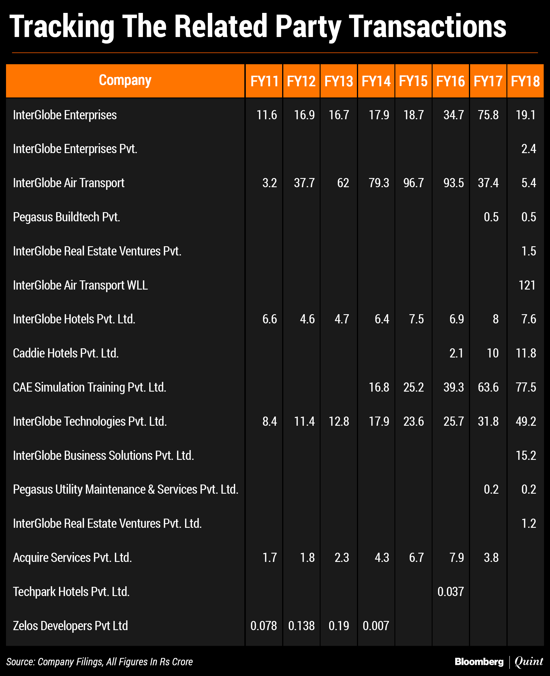 Gangwal's letters to SEBI and shareholders share no details about the offending related party transactions. In an earlier story BloombergQuint had noted that between InterGlobe and Bhatia entities had risen several-fold in the past 8 years, though amounted to less than 1.4 percent of total revenue.