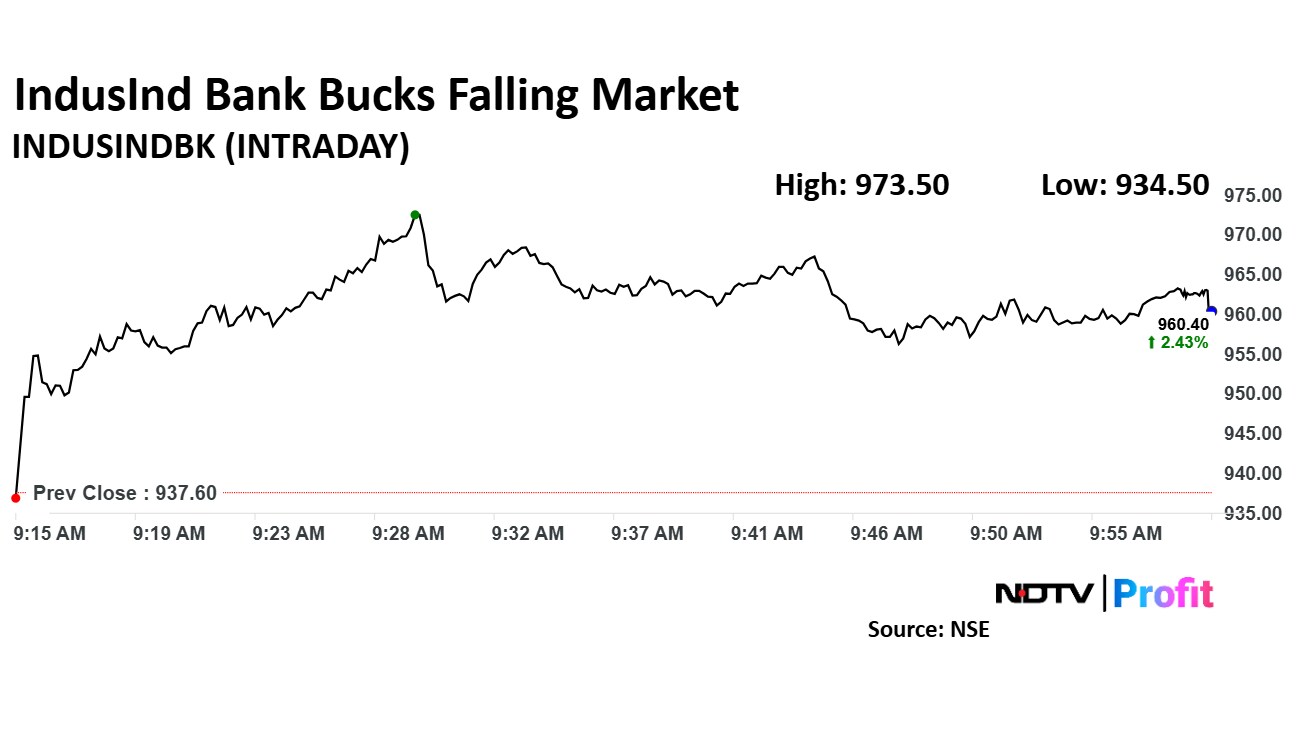The IndusInd Bank stock was trading 2.73% higher at Rs 962.70 apiece as of 9:59 a.m., after touching an intraday high of Rs 973.50 per share. Meanwhile, the benchmark Nifty 50 was down 0.88% to 23,227.