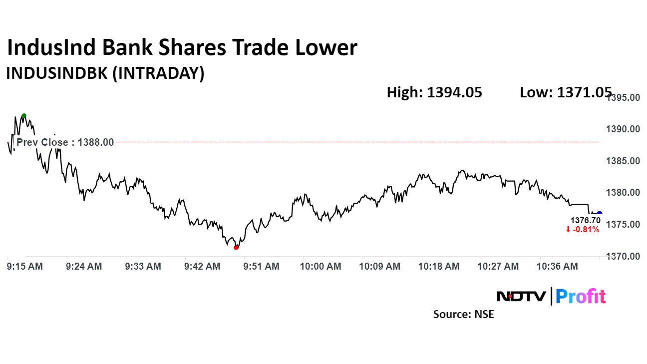 IndusInd Bank's stock fell as much as 0.85% during the day before paring loss to trade 0.54% lower at Rs 1,375.3 apiece, compared to a 0.29% advance in the benchmark Nifty 50 as of 10:46 a.m.