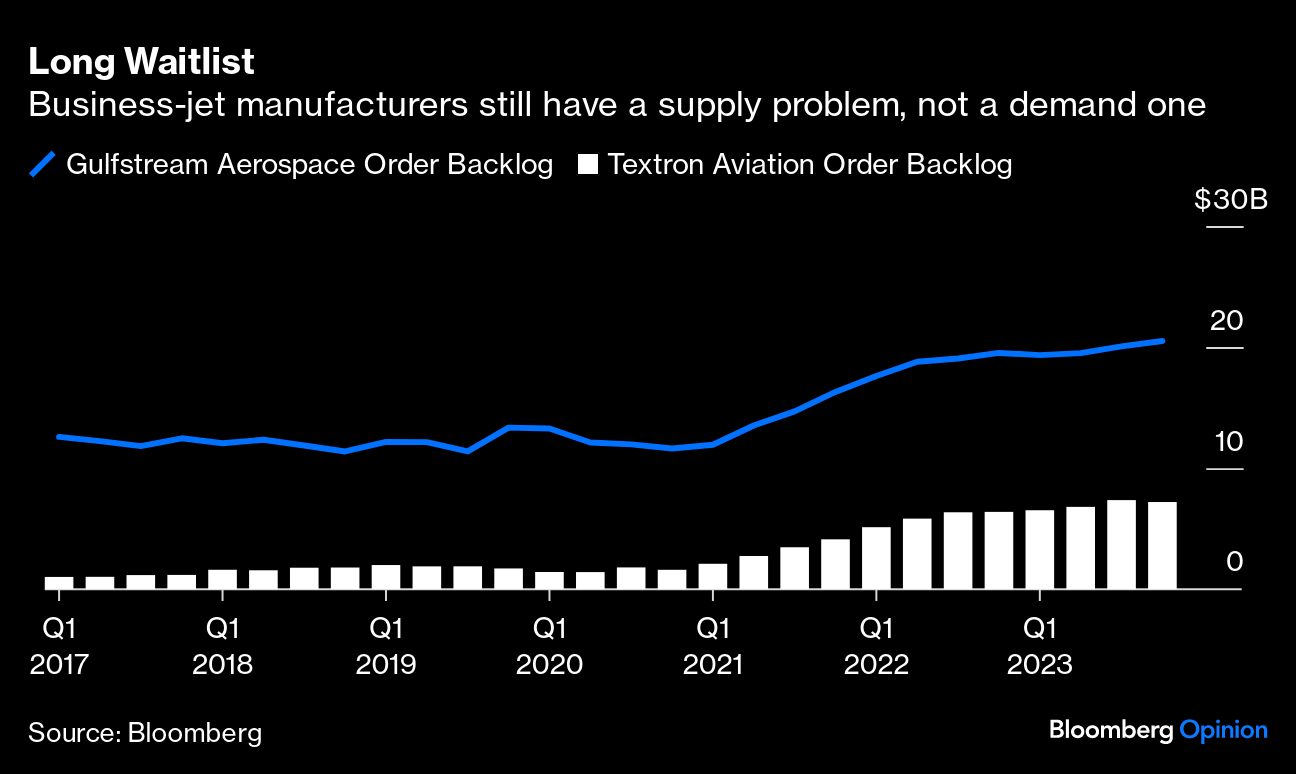 The biggest risk to the business-jet market may be operators of private-plane taxi services whose financial challenges threaten to unleash extra inventory.ย Wheels Up Experience Inc., the private-jet service operator that mergedย with a blank-check company in 2021, came uncomfortably close to bankruptcy last year before securingย a rescue financing packageย from a consortium of investors including Knighthead Capital Management, Certares Management and Delta Air Lines Inc. Bonds of rival VistaJet have come under pressure recently amid high losses and debts, as documented by the Wall Street Journal.ย The number of used jets for sale has started to tick up from historically low levels, but for now, most of the available planes are quite old and there's little riskย of that inventory cannibalizing demand for new models, Donnelly of Textron said. Manufacturers are still playing catch-up from the extended lull in private jet sales after the global financial crisis, so that also helps keep supply under control, Melius Research analyst Robert Spingarn wrote in a report this month.ย