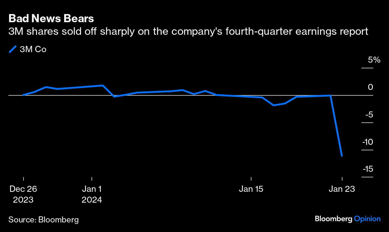 3M Co. had its worst earnings day selloff in five years this week after the company's 2024 guidance fell short of analysts' estimates. The stock closed down 11% on Tuesday for the biggest drop since April 2019.ย The reaction seems a tad extreme; there was nothing terribly new or noteworthy to worry about in 3M's latest investor update, and the company has had no shortage of disappointing earnings reports and legal woes in recent years. 3M's deep market rout over the past three years should make this a stock that's โmoreย likely to perk up on bad news than go down,โ Melius Research analyst Scott Davis wrote in a note. โI know people hate this stock, I get it โย the company has been accident prone for some time, but this is a head scratcher to us.โ And yet, 3M shares were trading down again on Wednesday, suggesting this was more than just a knee-jerk selloff.ย