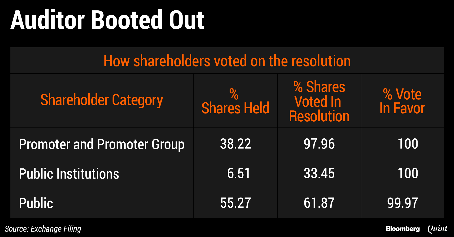 Of the institutional investors holding 4.3 crore shares, or 6.5 percent, those representing 1.4 crore shares voted. All of them, including foreign investors, bank, financial institutions and mutual funds, supported the auditor's ouster.