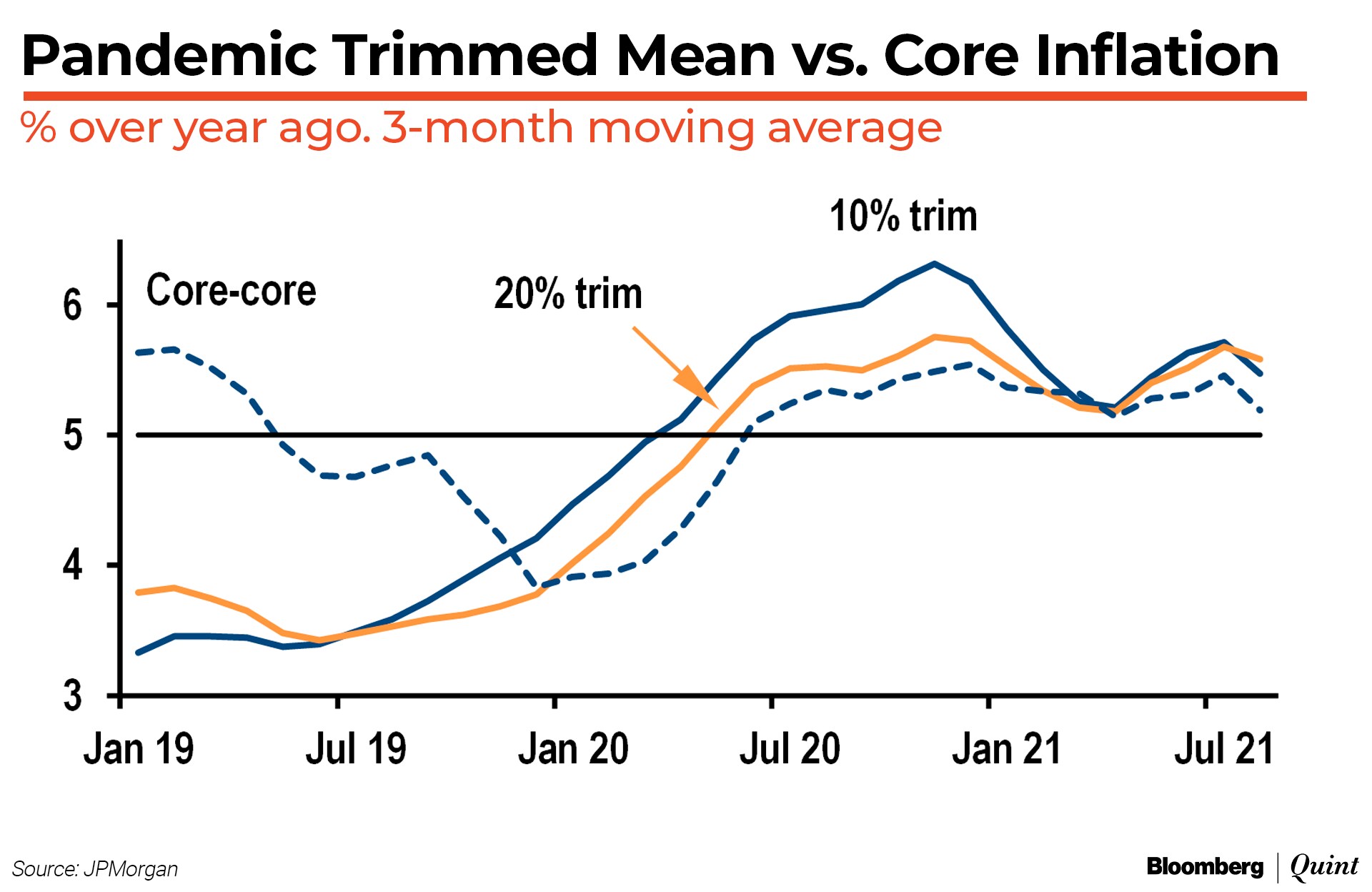 In a similar vein, we create a ‘pandemic-trimmed mean' for India, eliminating outliers on both sides. Because of the unprecedented nature of the pandemic, with sudden and severe supply shocks that fade over time, the approach we use is to estimate the average monthly increase of India's CPI basket (~300 items ) over that of the pandemic period. We then trim out 20% of items with the lowest and highest average sequential inflation rates. This preserves the same basket throughout the period and precludes the need to use a first approximation as in the standard trimmed mean computation.
