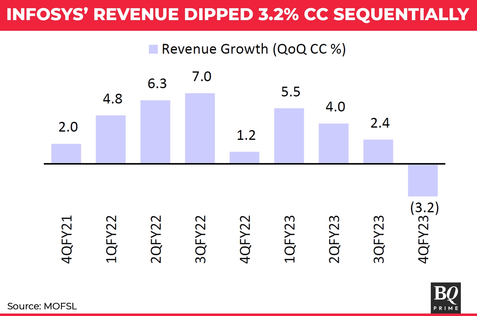 "The Q4 revenue growth was surprising and is likely to have a dampening effect on Infosys' FY24 growth, particularly since it suggests a significant impact on the firm's discretionary business due to the macro slowdown," Mukul Garg, research analyst at Motilal Oswal, said in an April 14 note co-authored by Pritesh Thakkar and Raj Prakash Bhanushali.