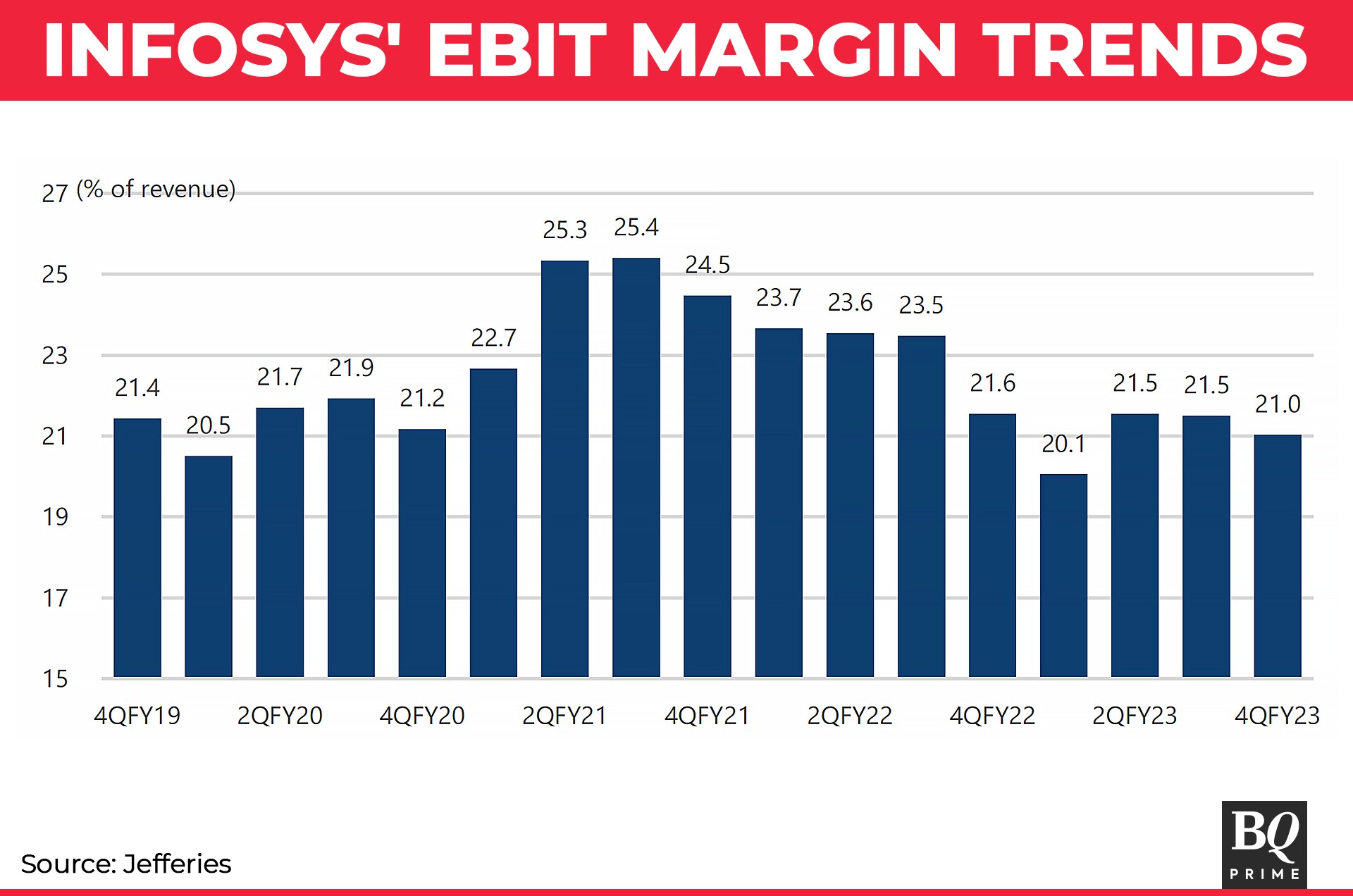Infosys can improve its margins through falling attrition and lower subcontracting costs, according to Nomura. The company's attrition rate eased to 20.9% in Q4 FY23 from 24.3% in the previous quarter, even as its total headcount fell 3,611—equivalent to 1% of its overall workforce.