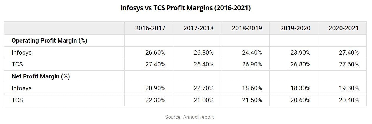 However, in terms of net profit margins, TCS seems to be leading again with five year net profit margin at 21.2%, against 20% of Infosys.