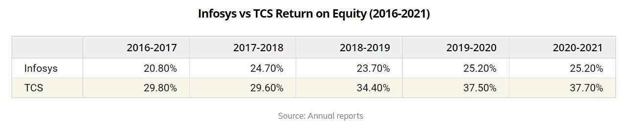 The average ROE for Infosys and TCS in the last five years stands at 23.9% and 33.8%, respectively. TCS has been more effective in terms of generating returns for its shareholders than Infosys.
