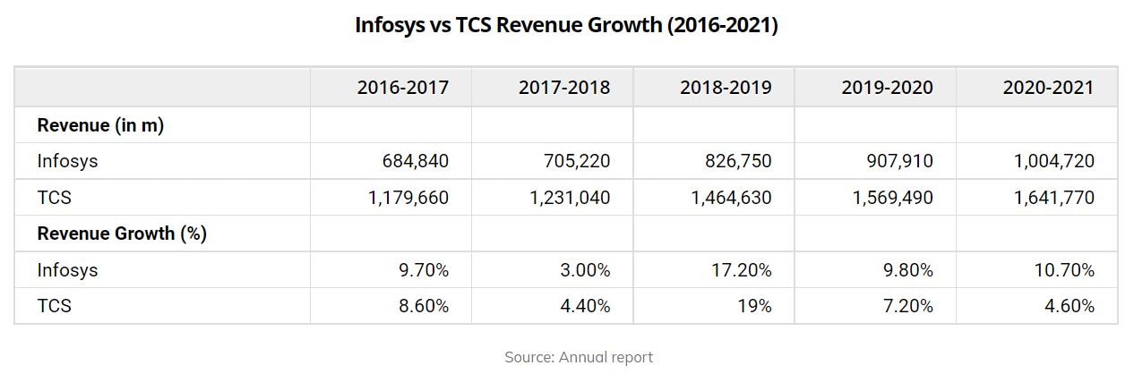 In the last five years (2017-2021), revenue for Infosys and TCS grew at a CAGR of 8% and 7%, respectively.