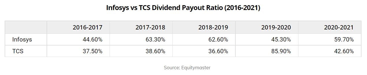 Even though the dividend yields are low, the average dividend payout in the last five years for Infosys and TCS is pretty decent at 55.1% and 48.2%, respectively.
