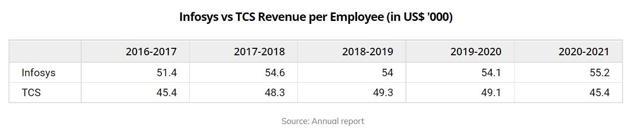 In the financial year 2021, the revenue per employee for Infosys and TCS stood at US$ 55,200 and US$ 45,300, respectively.