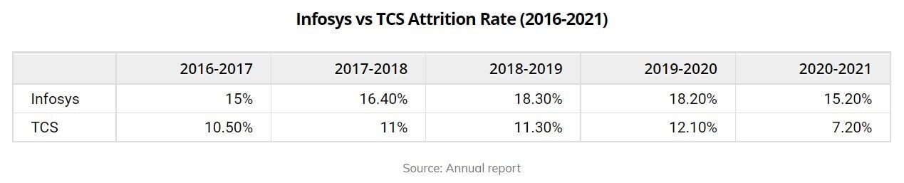 The attrition rate for TCS stood at 7.2% during the financial year 2021 compared to that of Infosys which stood at 15.2%.