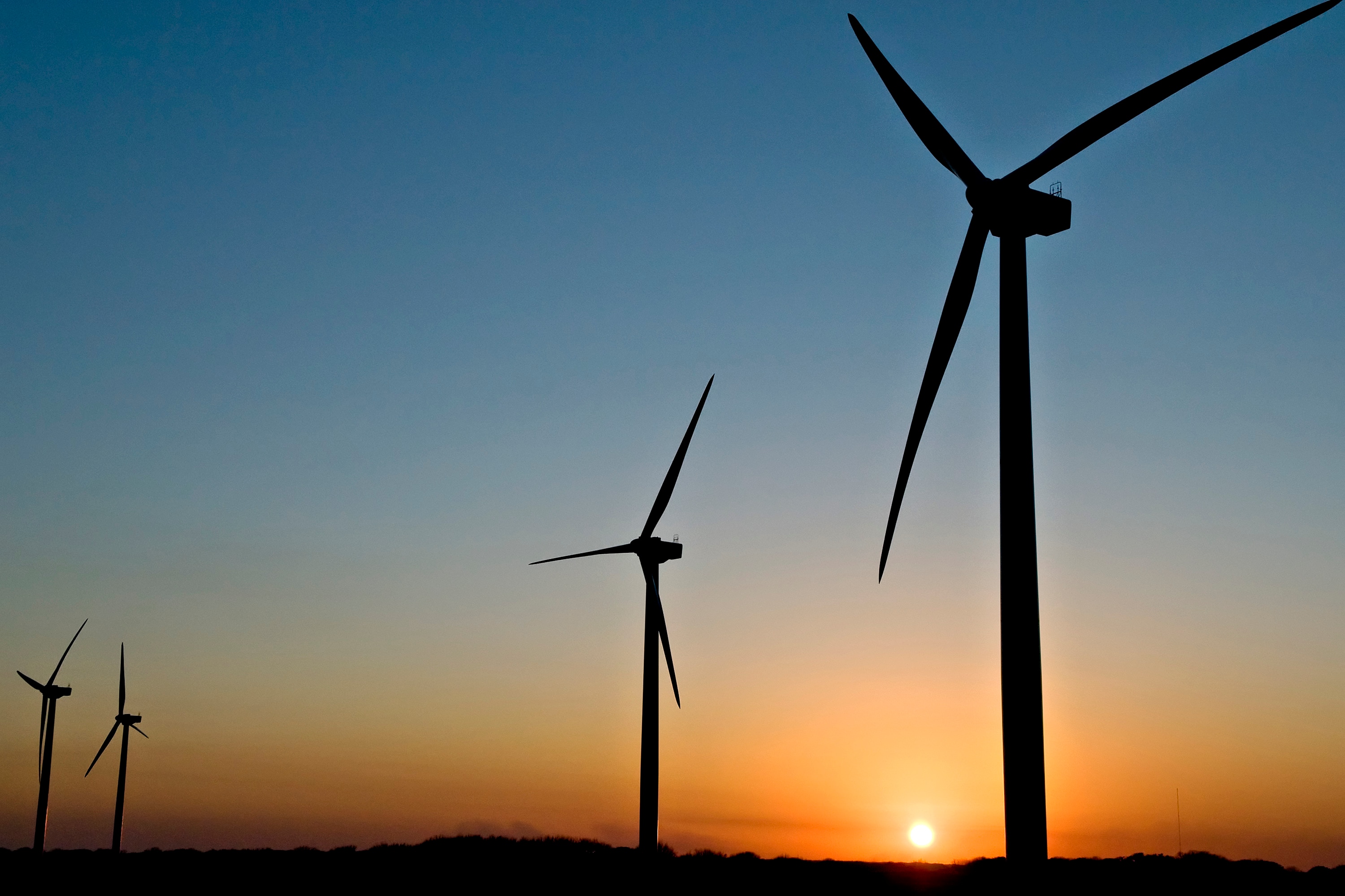 Wind turbines that are part of Wind Project stand at sunset (Photographer: Eddie Seal/Bloomberg)