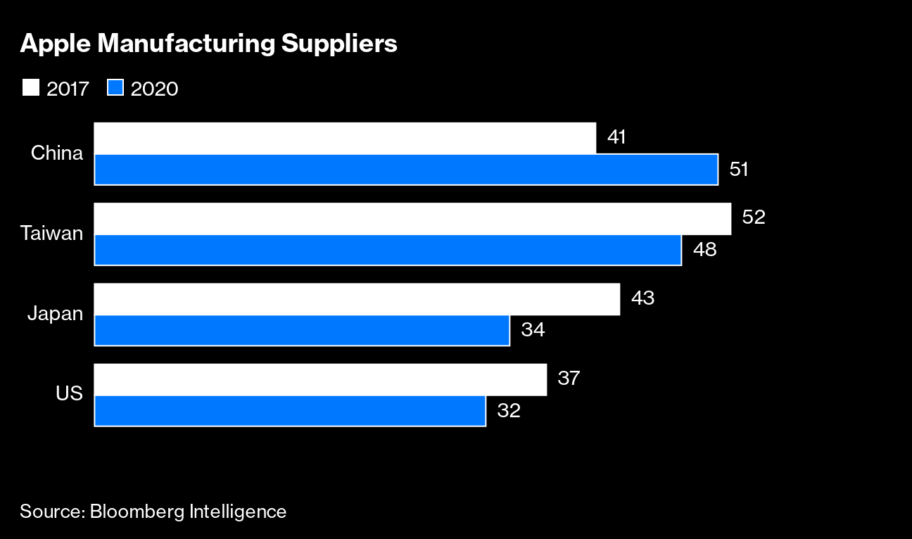 A more durable shift began in 2017, when Apple began making some low-end iPhones in India. On balance, it wasn't doing much to weaken its ties to China at that time; a Bloomberg Intelligence analysis found that the number of Chinese suppliers rose from 2017 to 2020, while the number of suppliers dropped in some other countries. These operations, which have been slowly developing since then, are now the foundation for much of the company's effort to make its signature products outside of China.