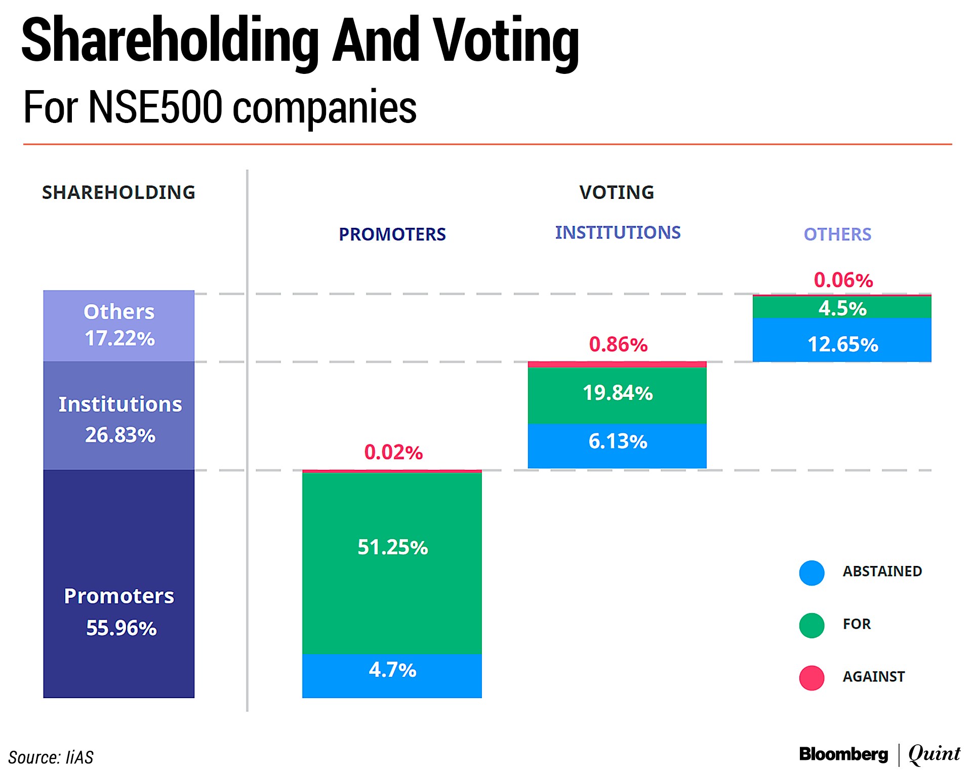 Promoters, who own 55.96% of Nifty 500 companies' equity, almost always voted in support of resolution. The 0.03% of the times they voted against any particular resolution is largely in case of intra-promoter group disputes.