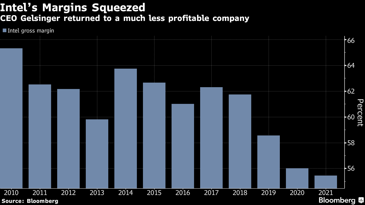 The company's new target for 2022 revenue is $65 billion to $68 billion. Gross margin, a measure of profitability that represents the percentage of sales left after deducting production costs, will be 49% for the year, 9.1 points narrower than a year earlier and 3 points shy of what the company had targeted. That metric of profitability, once touted as an indication of Intel's strength, is being squeezed by increasing competition, and is now more than 10 points narrower than the company's annual gross margins for much of the past decade.