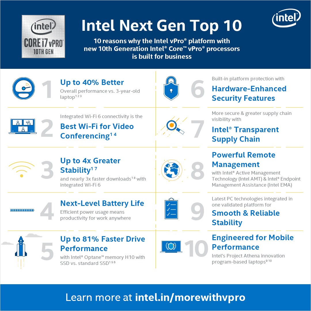 Business demands never cease. As CIOs and IT Managers manage more devices with around-the-clock PC maintenance and operations, they also grapple with security threats that are more sophisticated than ever before. What they need is an integrated platform that delivers the latest PC technologies in one validated solution built to provide business-class performance, hardware-enhanced security features, modern remote manageability, and PC fleet stability. The Intel vPro® platform is all the things CIOs need their PCs to be. Accelerate productivity and reduce costs—all while giving employees a great user experience. Here are 10 reasons why the Intel vPro platform is perfect for your organisation.