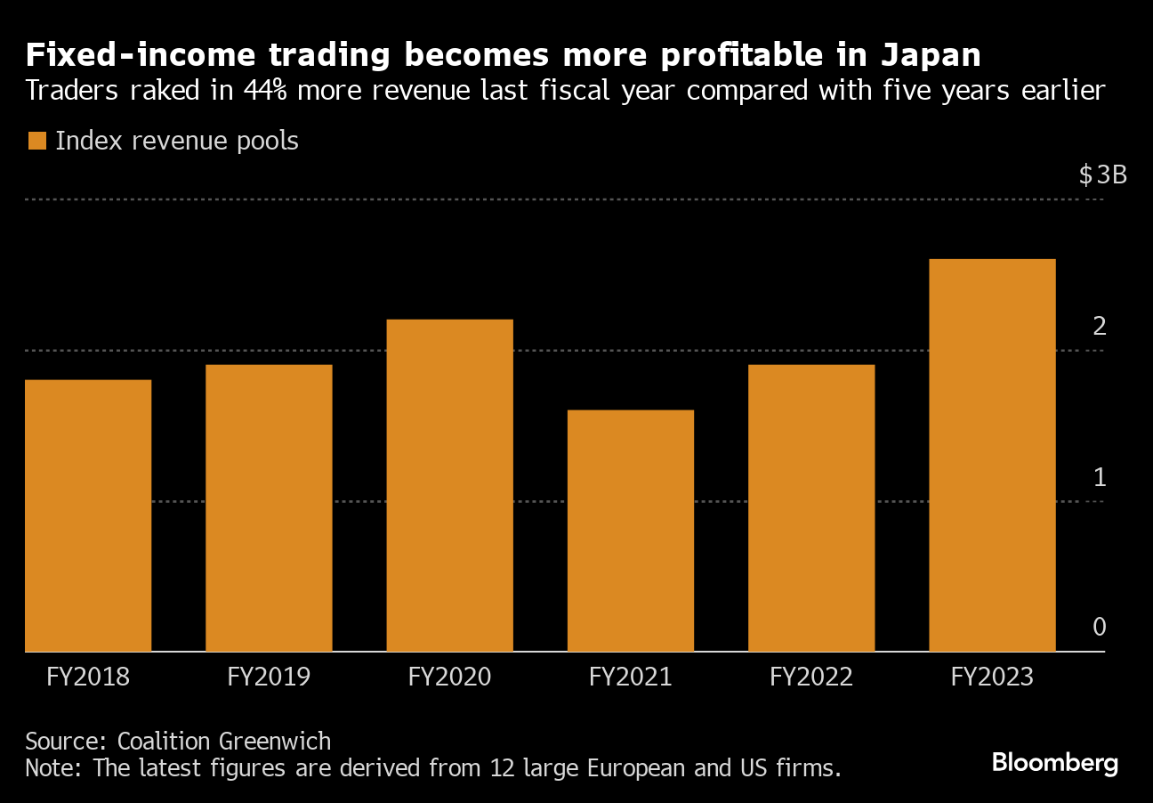 Revenue from Japan fixed-income trading at Wall Street and European firms rose by more than a third from a year earlier to $2.6 billion in 2023, according to Coalition Greenwich. The data tracks the top 12 international banks in the US and Europe.