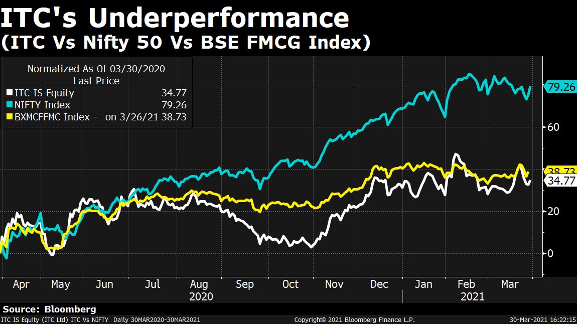 The forward premium on ITC that once stood at 30 times has fallen to 20 times, according to Bloomberg data.