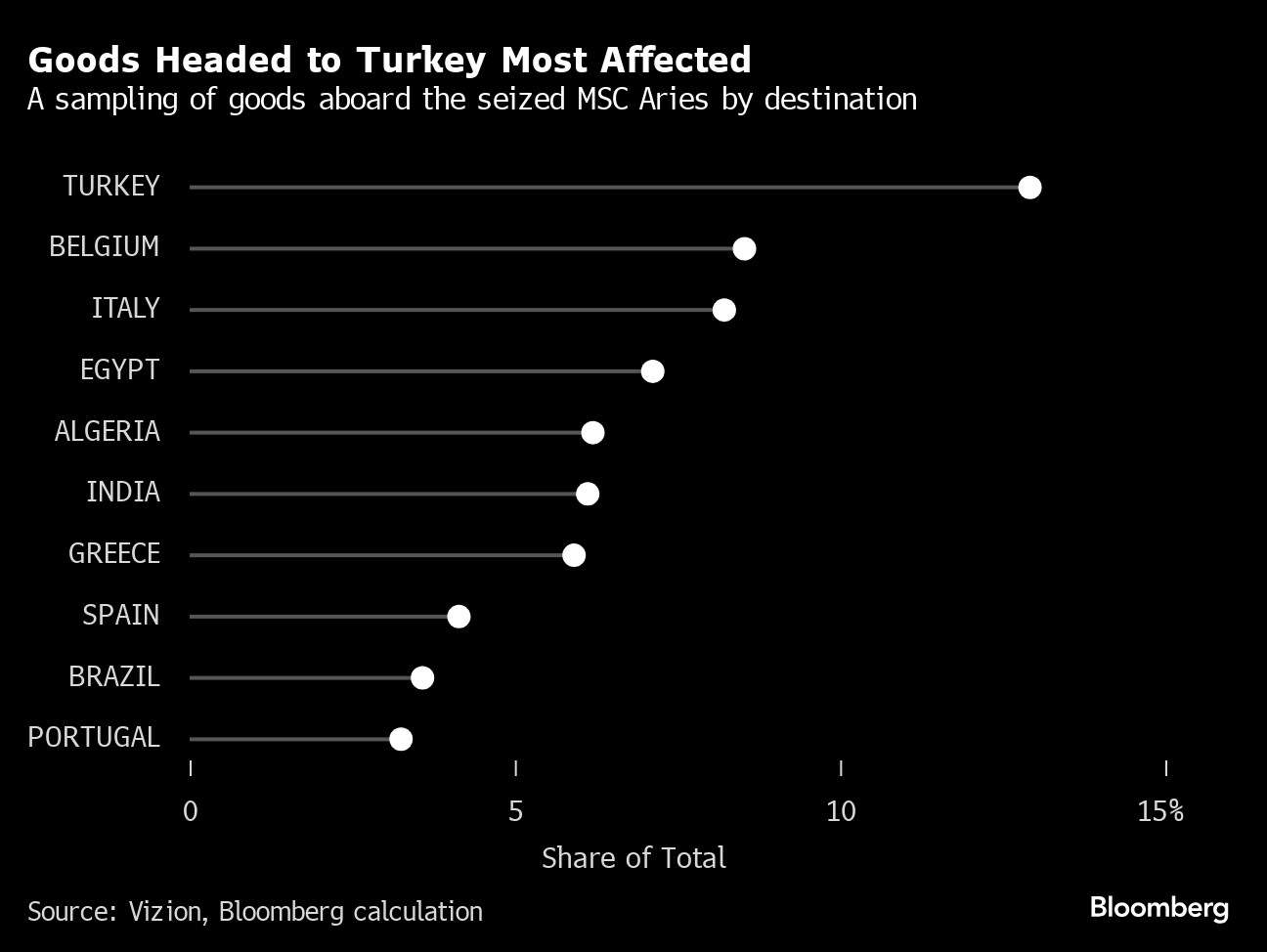 More than 90 containers on the MSC Aries were headed to the US, but America ranked outside the top 10 destinations, according to Vizion. The largest share of the goods was expected in Turkey, Belgium and Italy.
