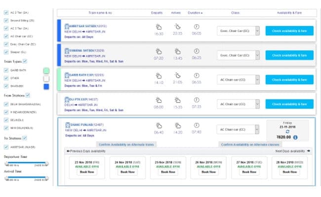 Step 4: On the next page, the user is required to select the train and click on the "Check availability and Fare" button to access information on its availability.