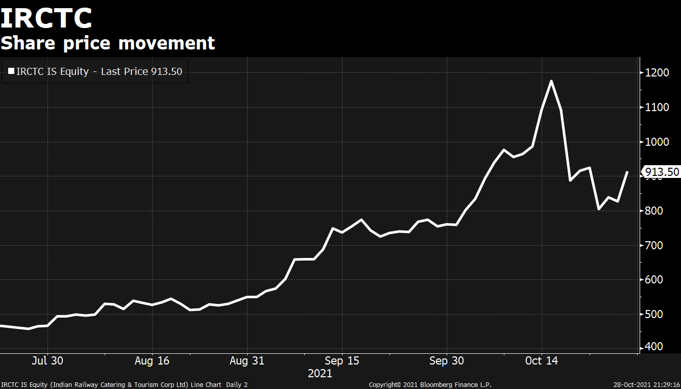 The rub-off propelled IRCTC's market value to a high of Rs 1 lakh crore briefly, before it started tumbling. The company's shares closed at Rs 913.50 apiece on an ex-split basis with a market cap of Rs 73,080 crore as on Oct. 28.