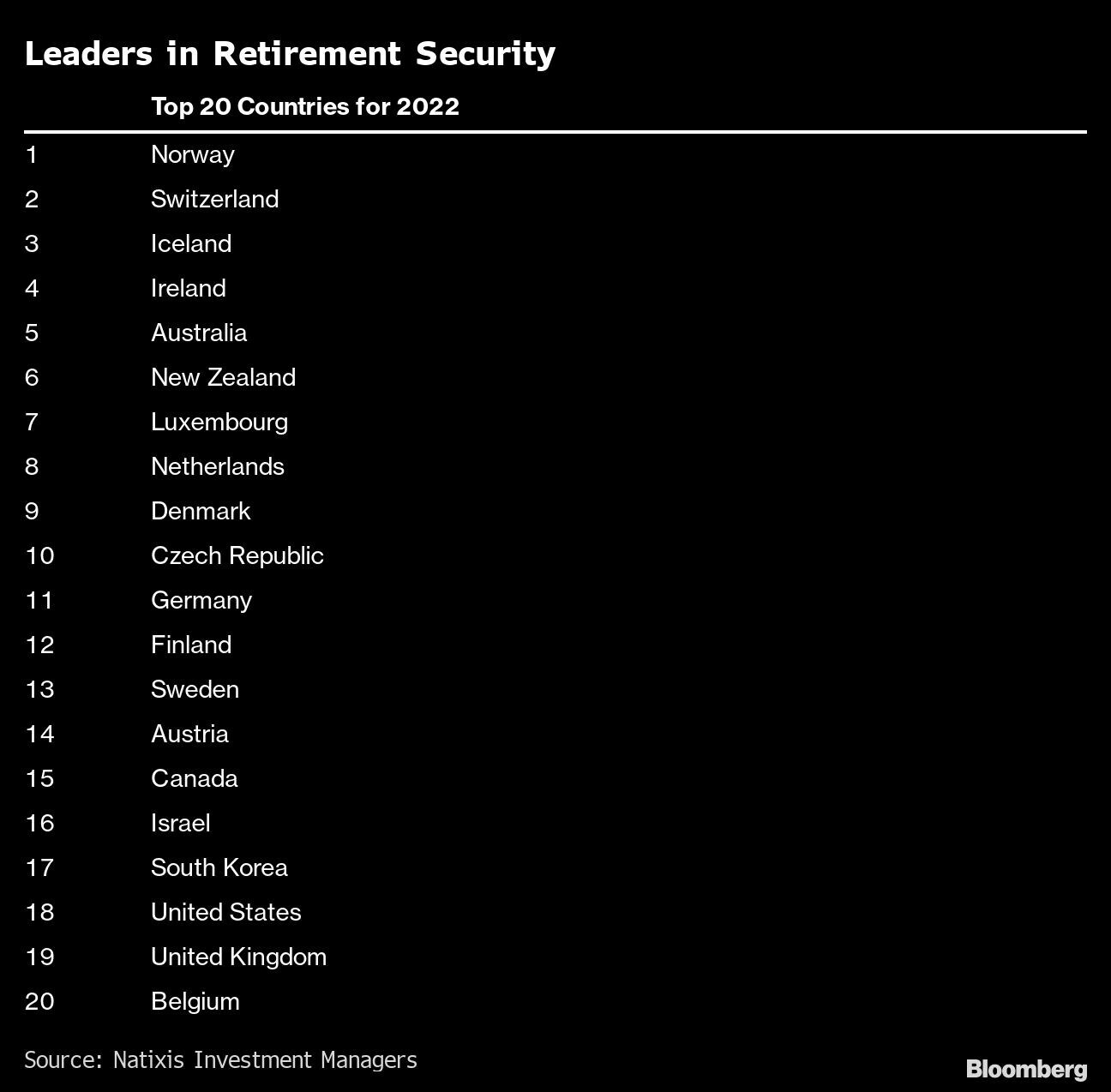 Natixis worked with CoreData Research to rank countries on 18 metrics that cover finances in retirement, material wellbeing, health and quality of life.